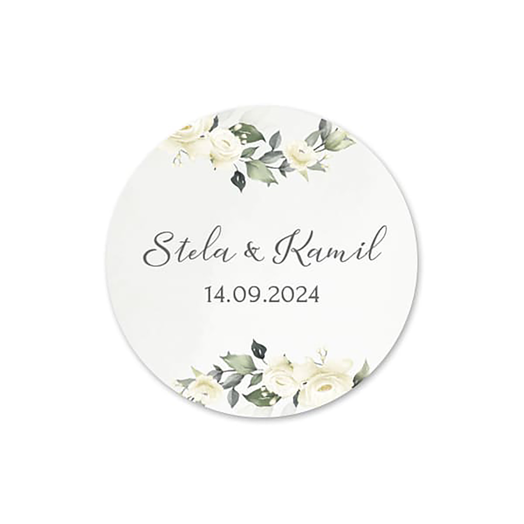 Samolepka je dostupná v různých velikostech a designových motivech, včetně personalizovaných nápisů, iniciál či svatebního data, což ji činí ideálním suvenýrem nebo detailním doplňkem vaší svatby. Elegantní kruhový tvar a jemné vzory dodají každé dekoraci styl a šmrnc, což umocní slavnostní atmosféru vašeho dne.