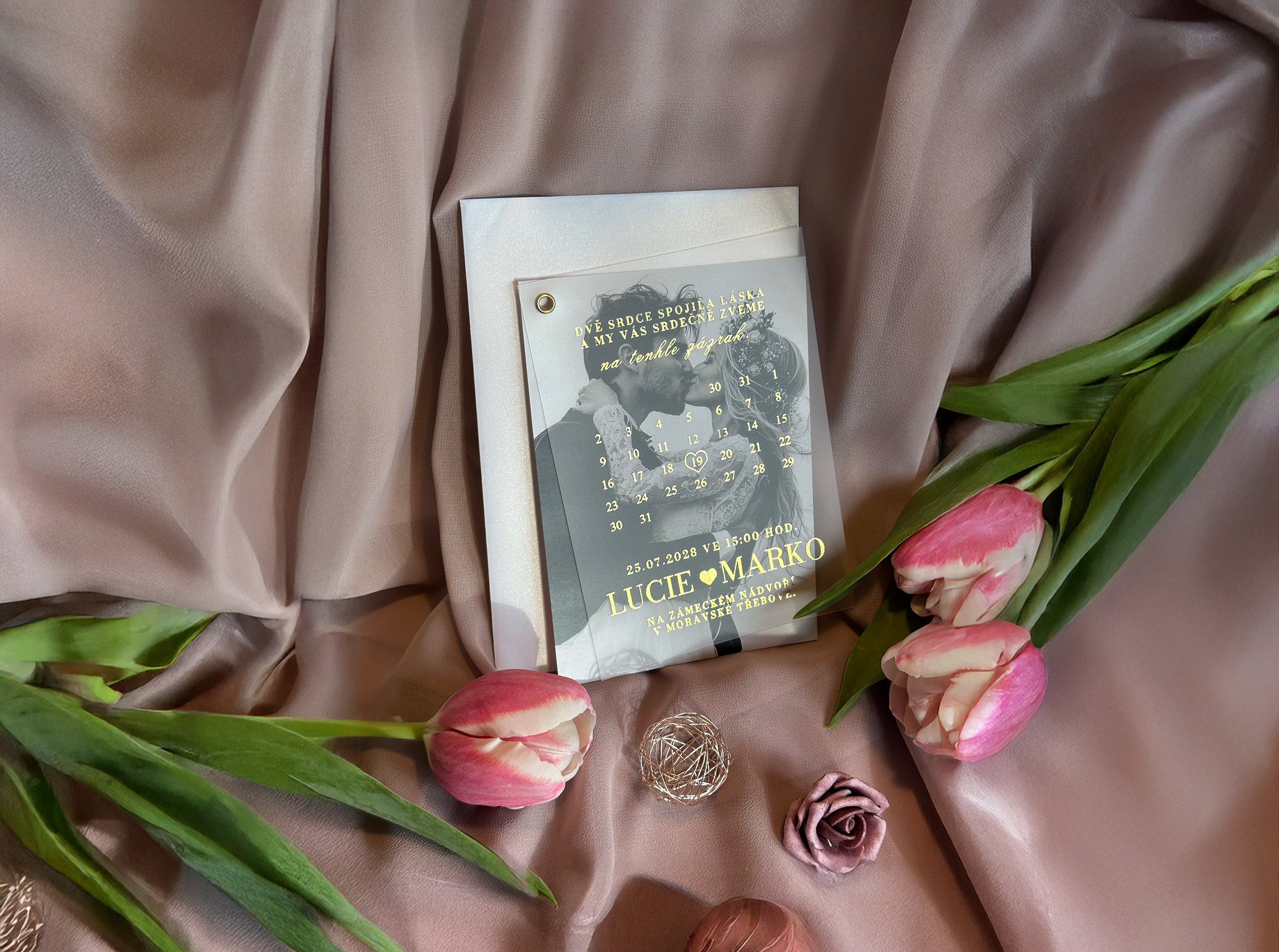 Dvouvrstvé svatební oznámení s podkladem s vaší fotografií a vrchní vrstvou z mléčného plastu, s metalickým nebo černým potiskem.