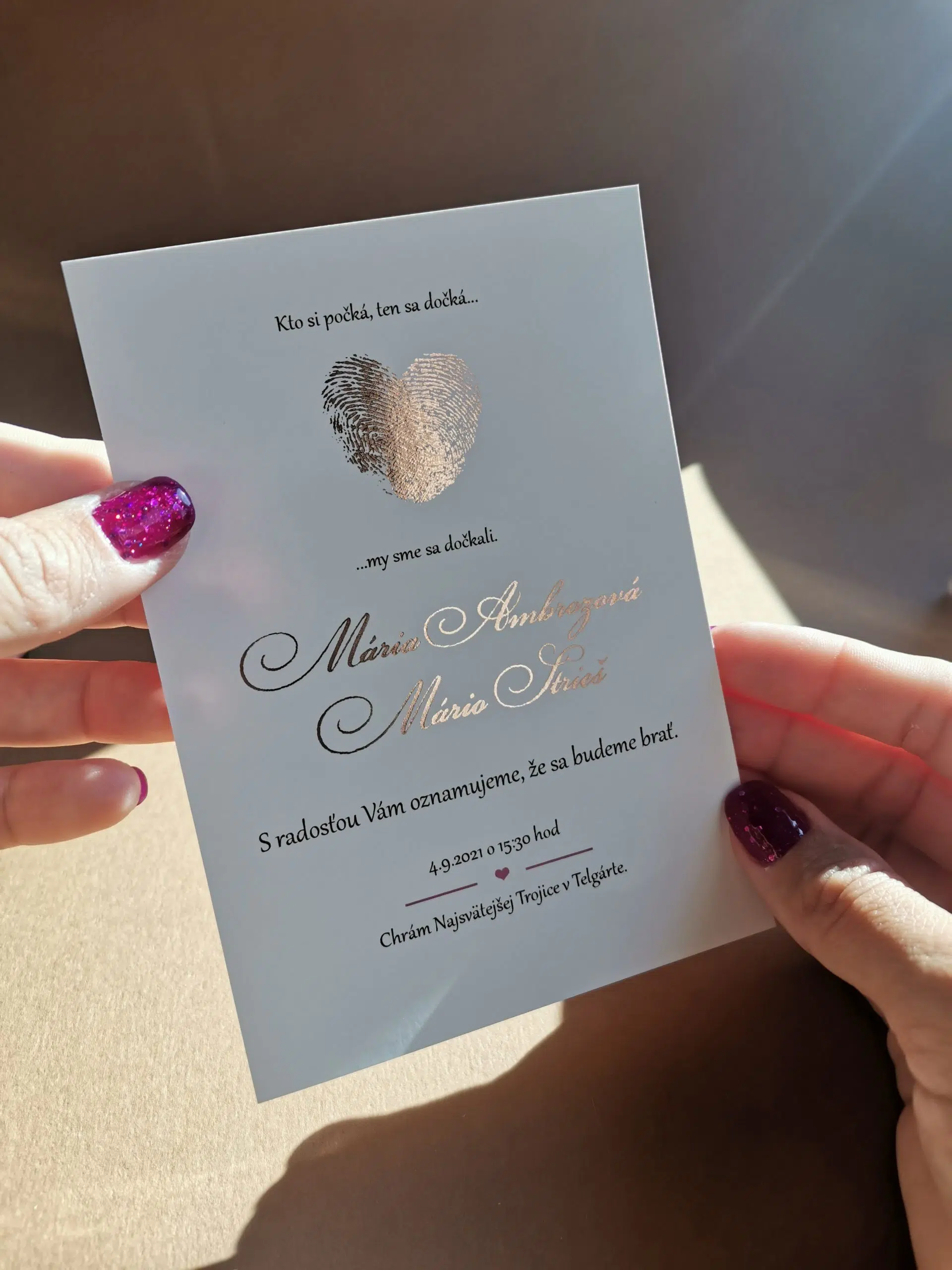 Krásné svatební oznámení s otisky prstů s metalickým potiskem. Metalický potisk dodává oznámení noblesu a jedinečnost.