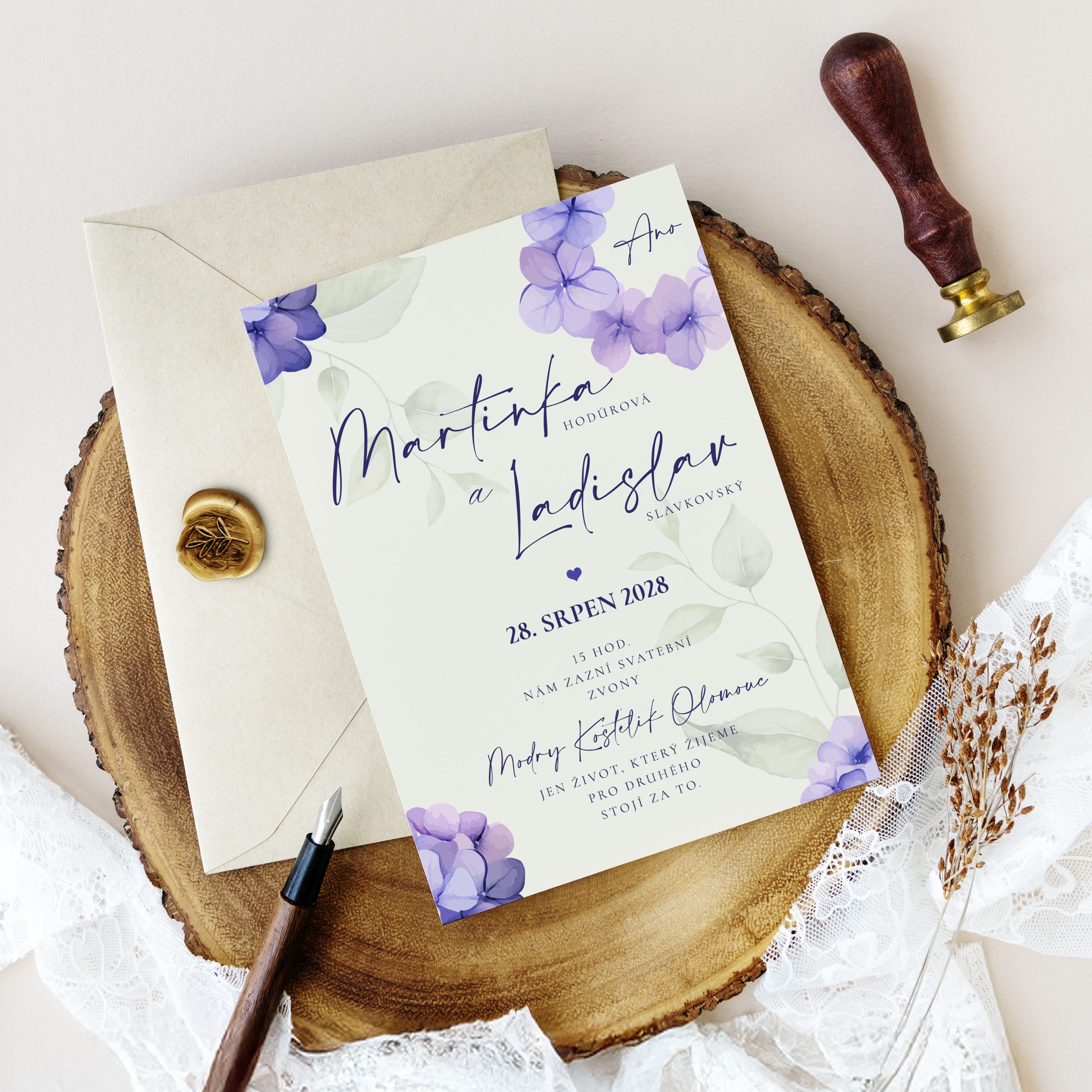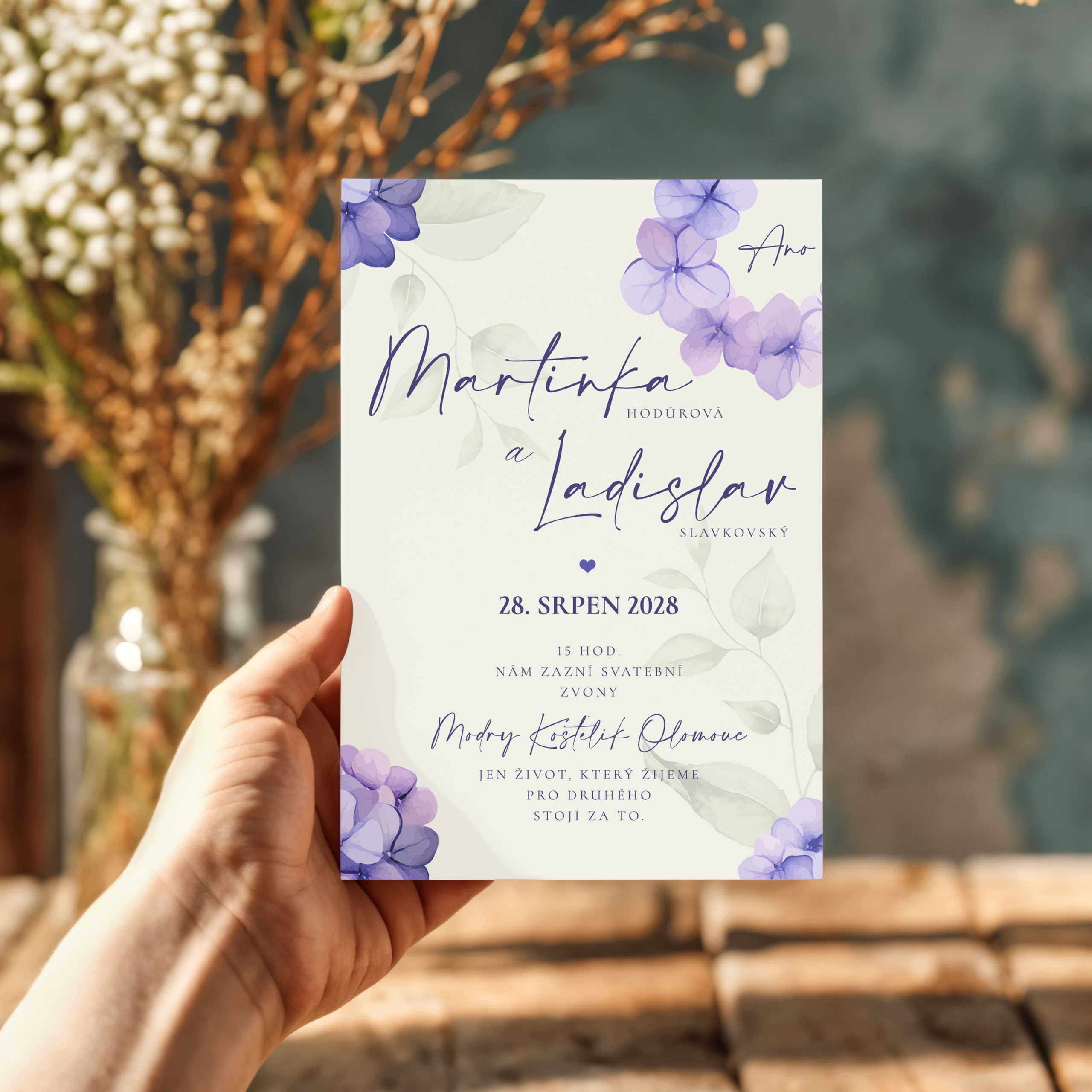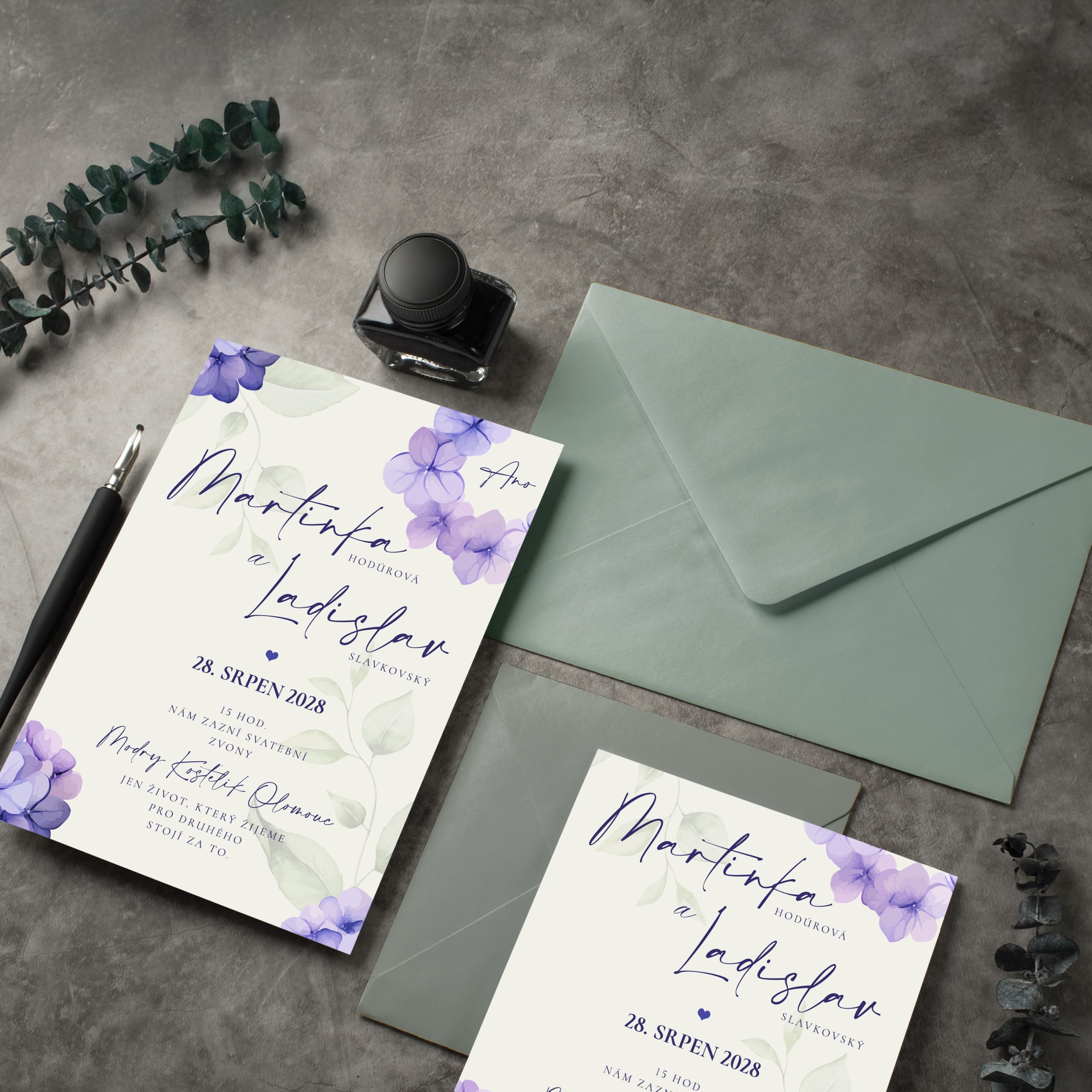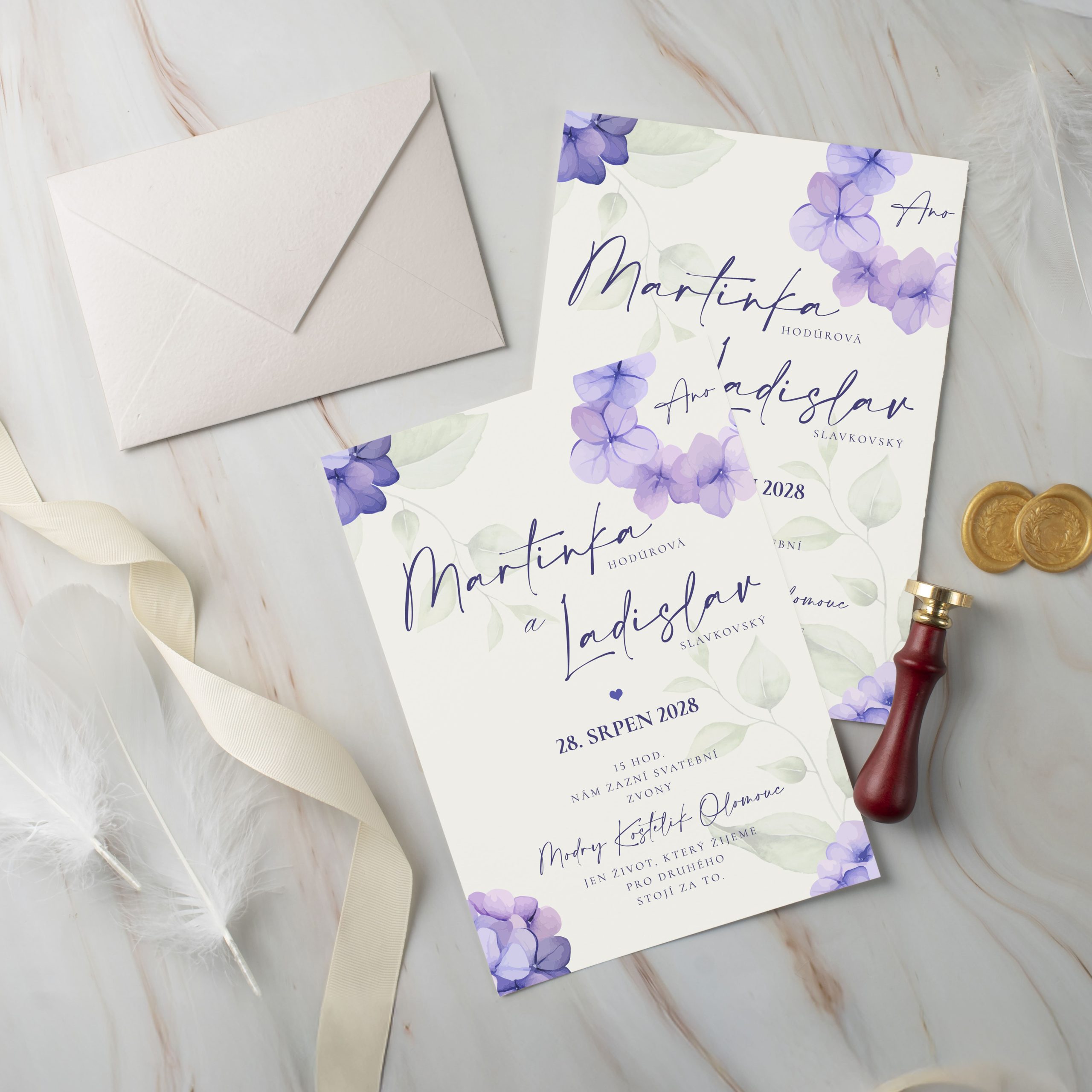 Luxusní svatební oznámení s fialkami LSO2025_CZ_0428. Pošlete toto milé a jemné svatební oznámení, je zdobené jemnými tóny fialové.