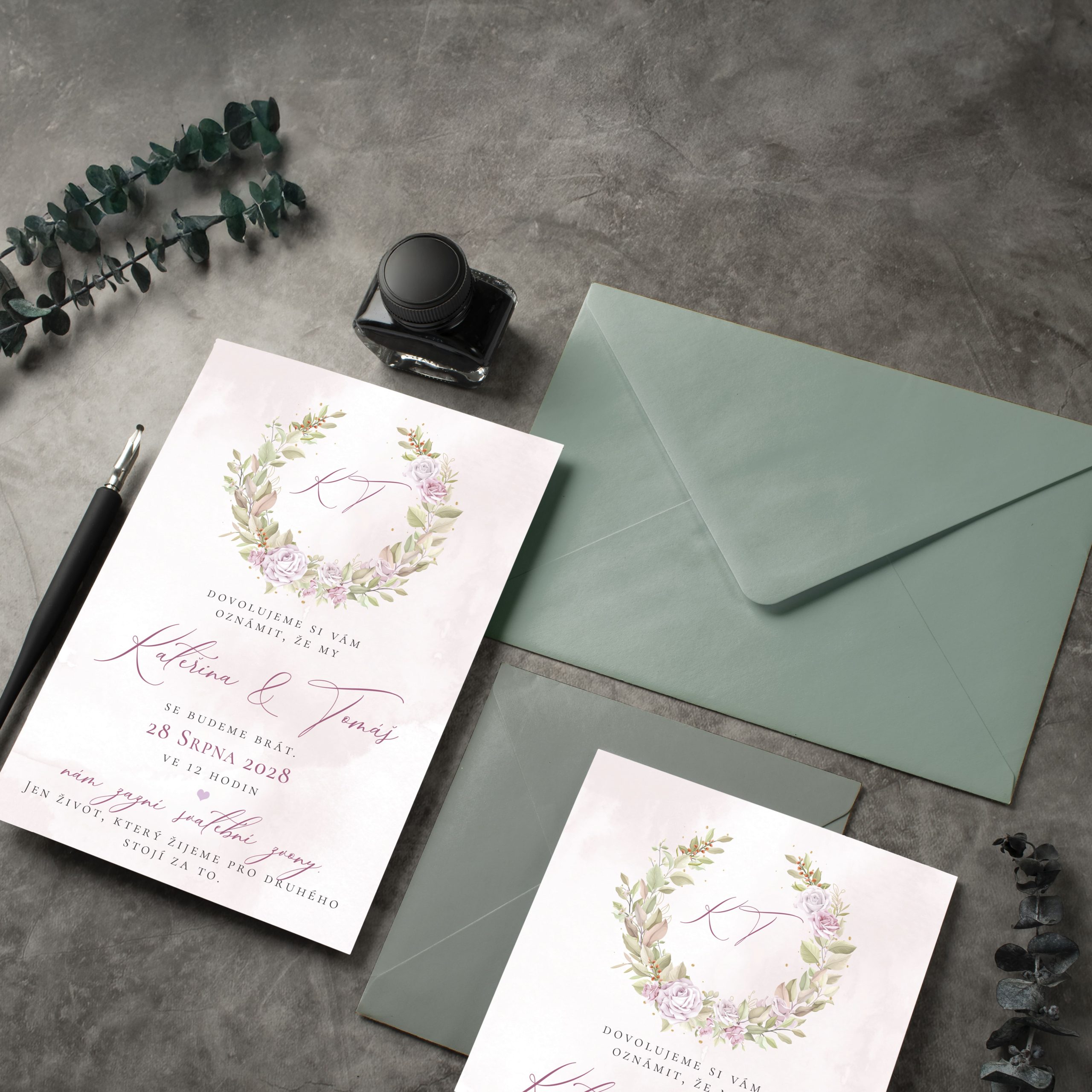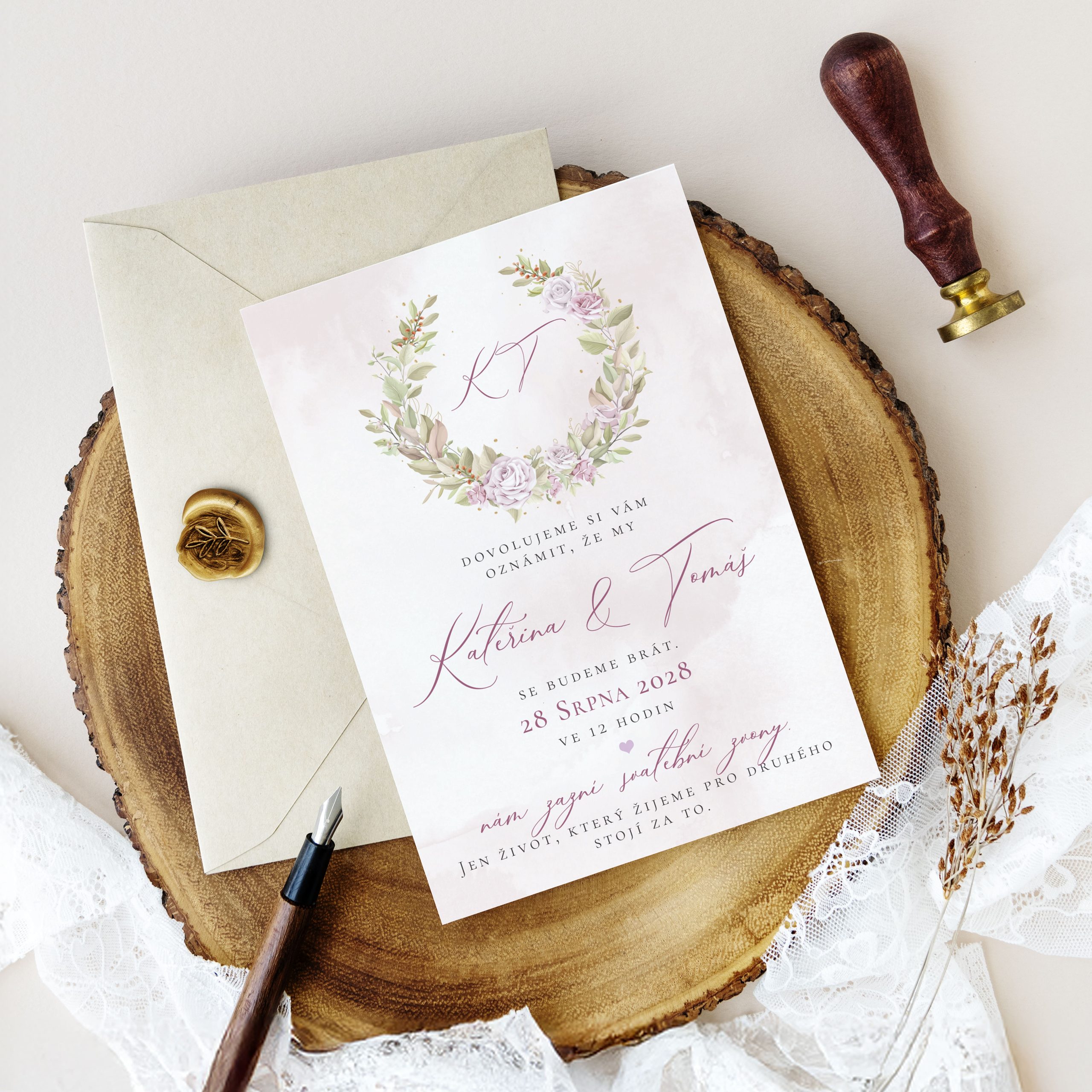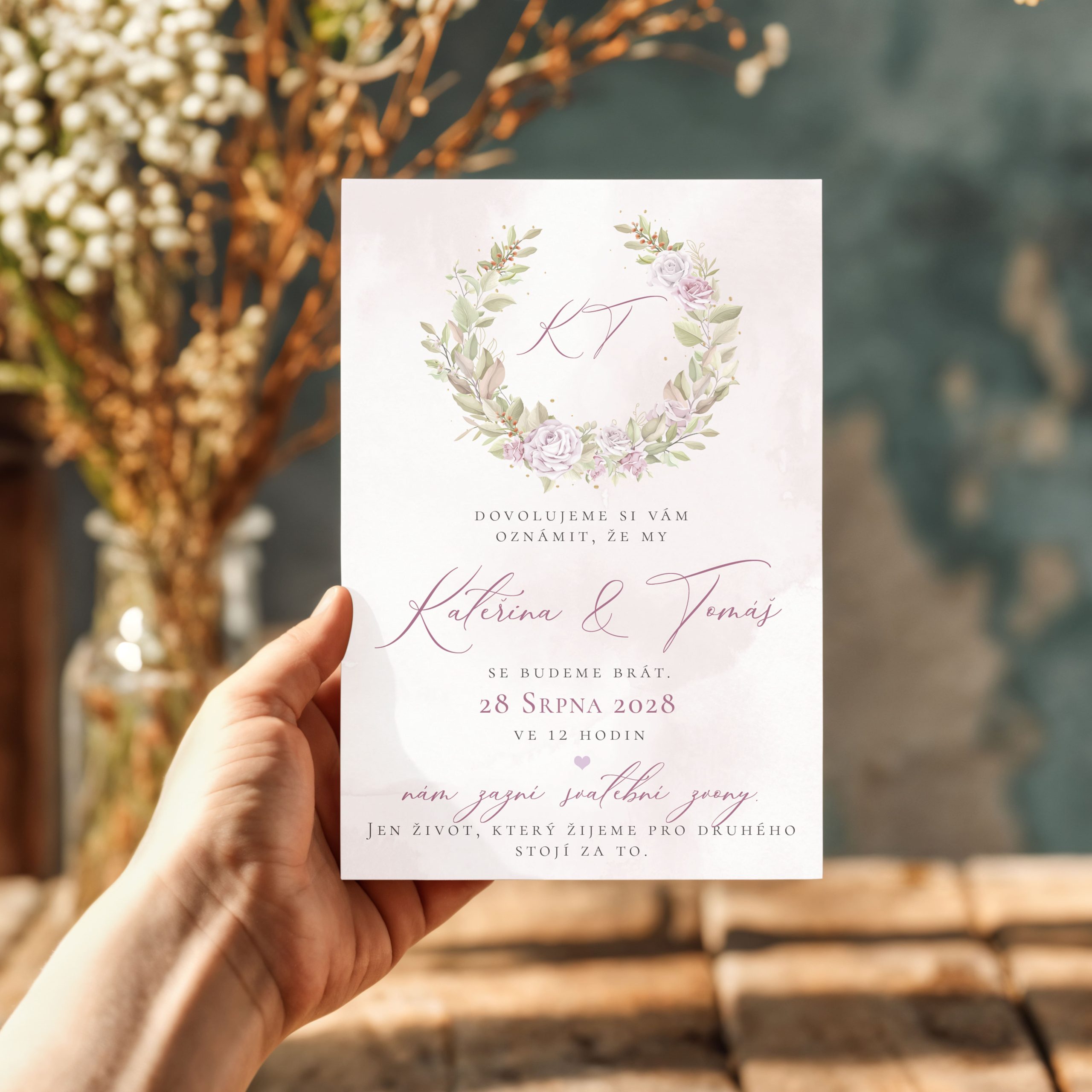 Luxusní svatební oznámení s fialovou růží LSO2025_CZ_0407. Pošlete toto milé a jemné svatební oznámení, je zdobené věncem, v kombinaci s jemnými tóny růžové.