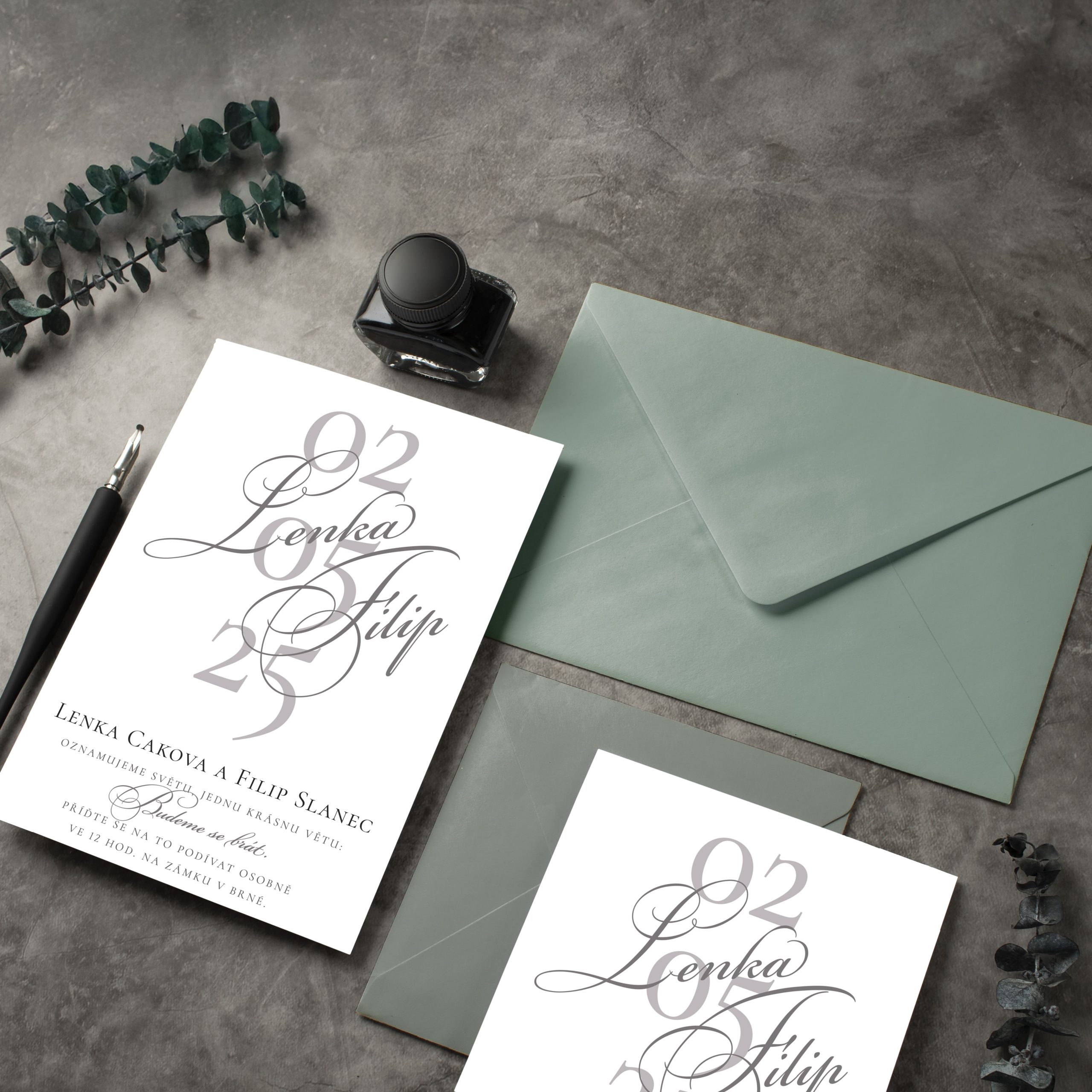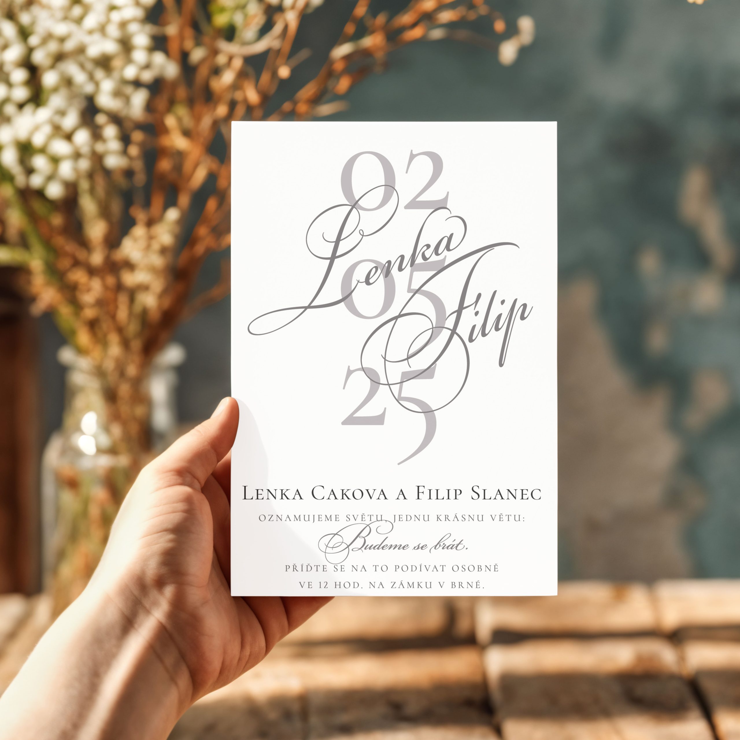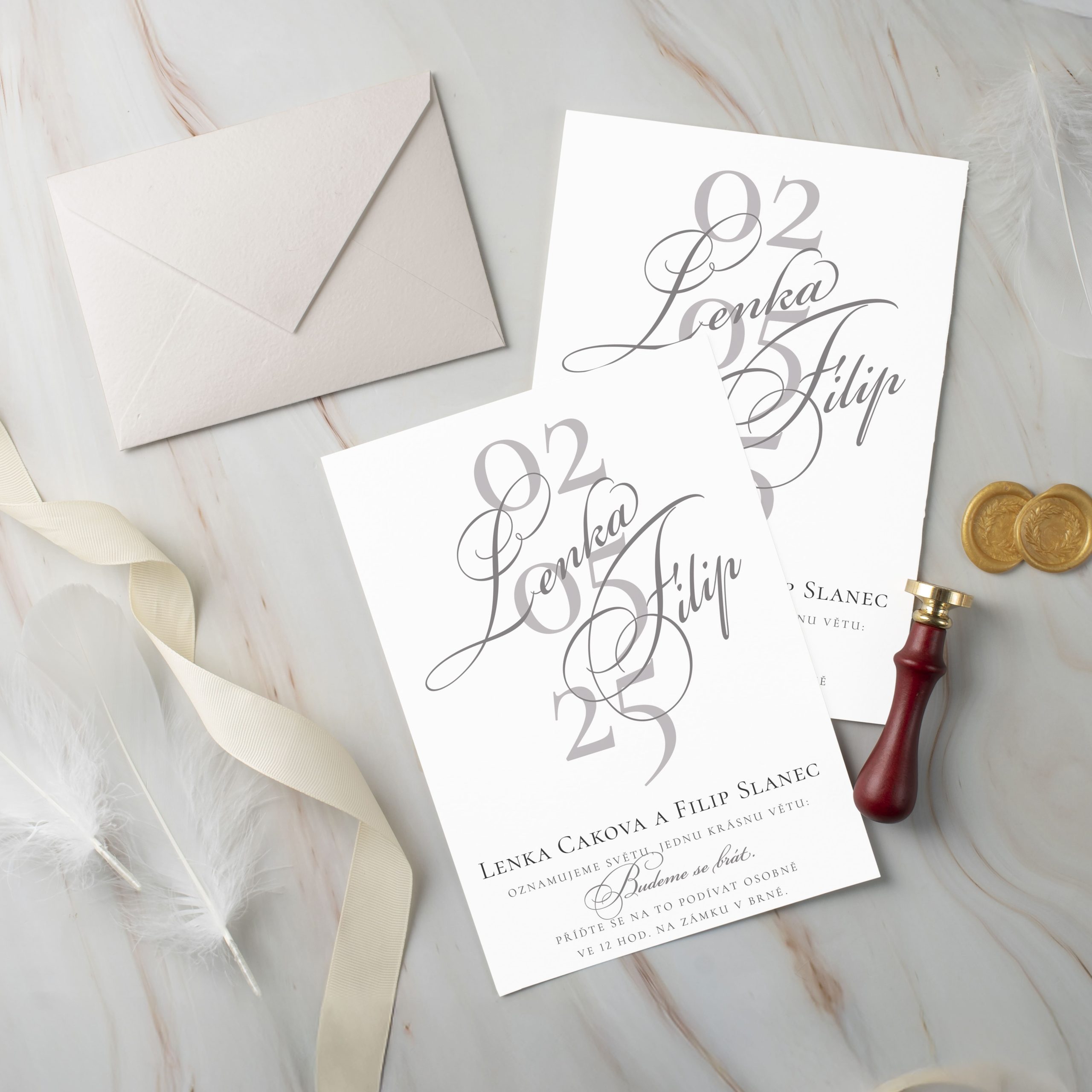 Luxusní svatební oznámení s šedým písmem LSO2025_CZ_0422. Pošlete toto milé a jemné svatební oznámení, je zdobené šedým písmem, v kombinaci s jemnými tóny bílé.