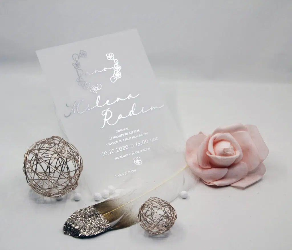 Luxusní svatební oznámení transparentní SILVER HERBS. Jemné, něžné lístky, efektní iniciály snoubenců a text ve stříbrné ražbě. To je to, co toto svatební oznámení dělá nápaditým a výjimečným. Pokud hledáte eleganci a něhu, toto oznámení je pro vás stvořené.