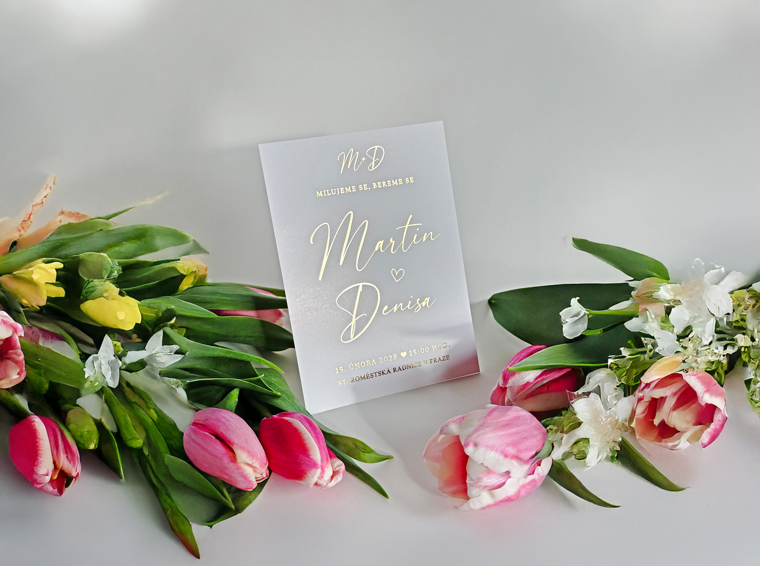 Představujeme luxusní svatební oznámení s metalickým tiskem, která spojují jemnost, lesk a nadčasovou eleganci. Každý detail je navržen tak, aby vaše oznámení nebylo jen papírem, ale vzpomínkou na začátek vašeho příběhu.