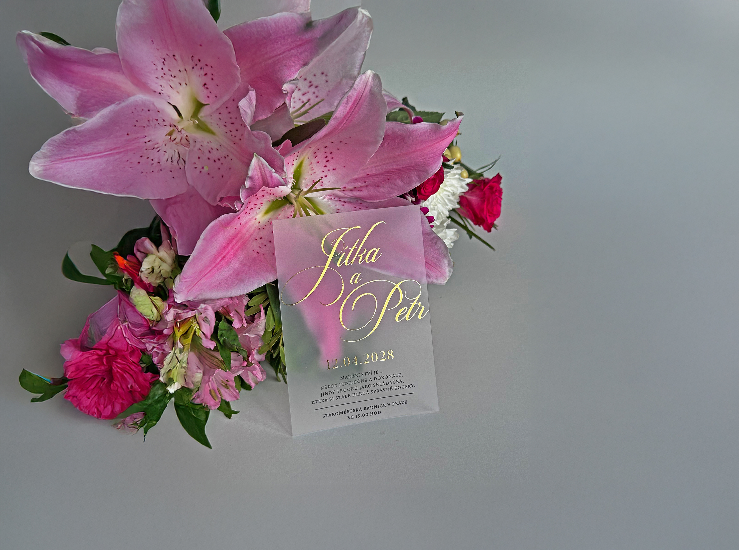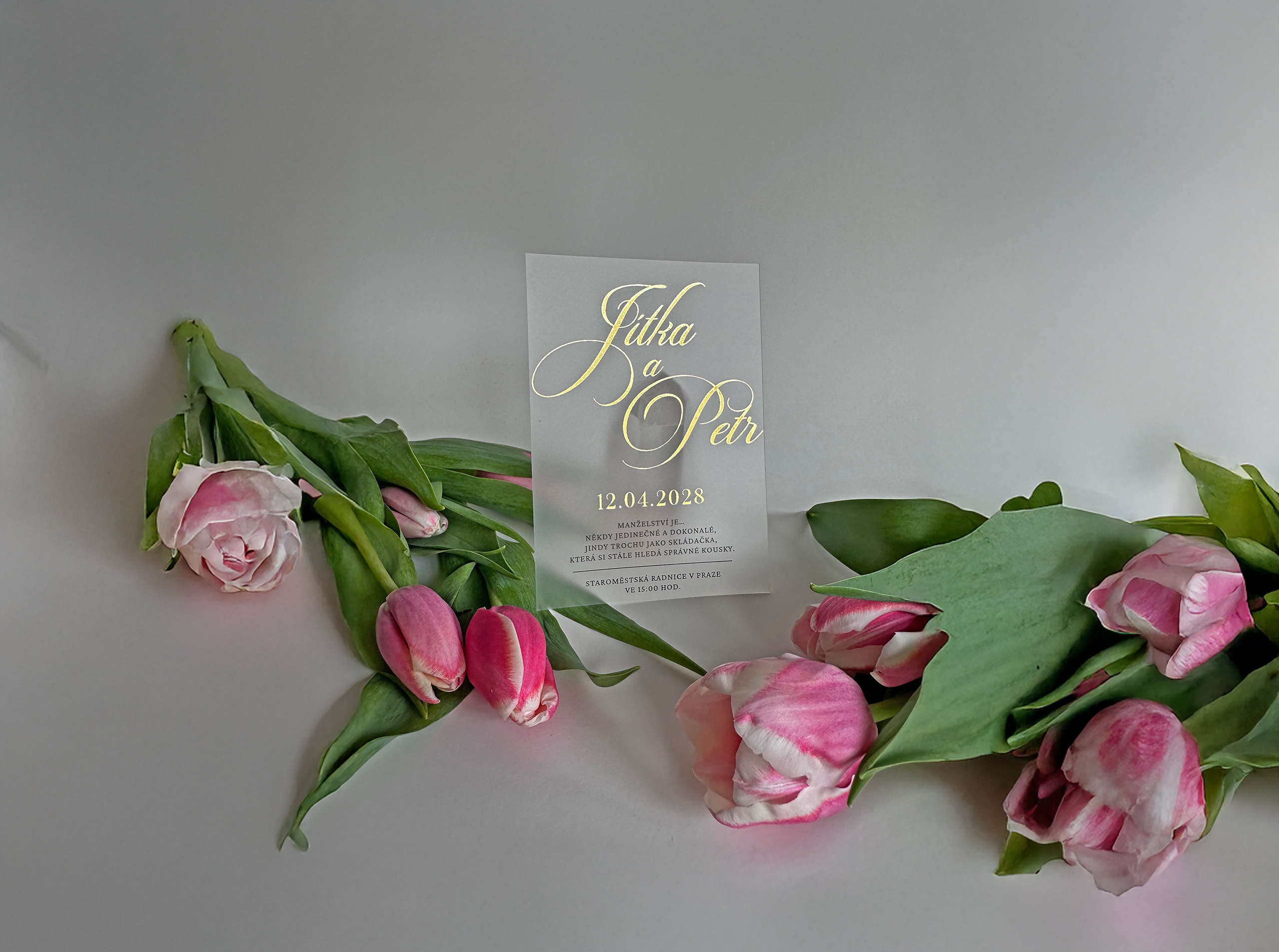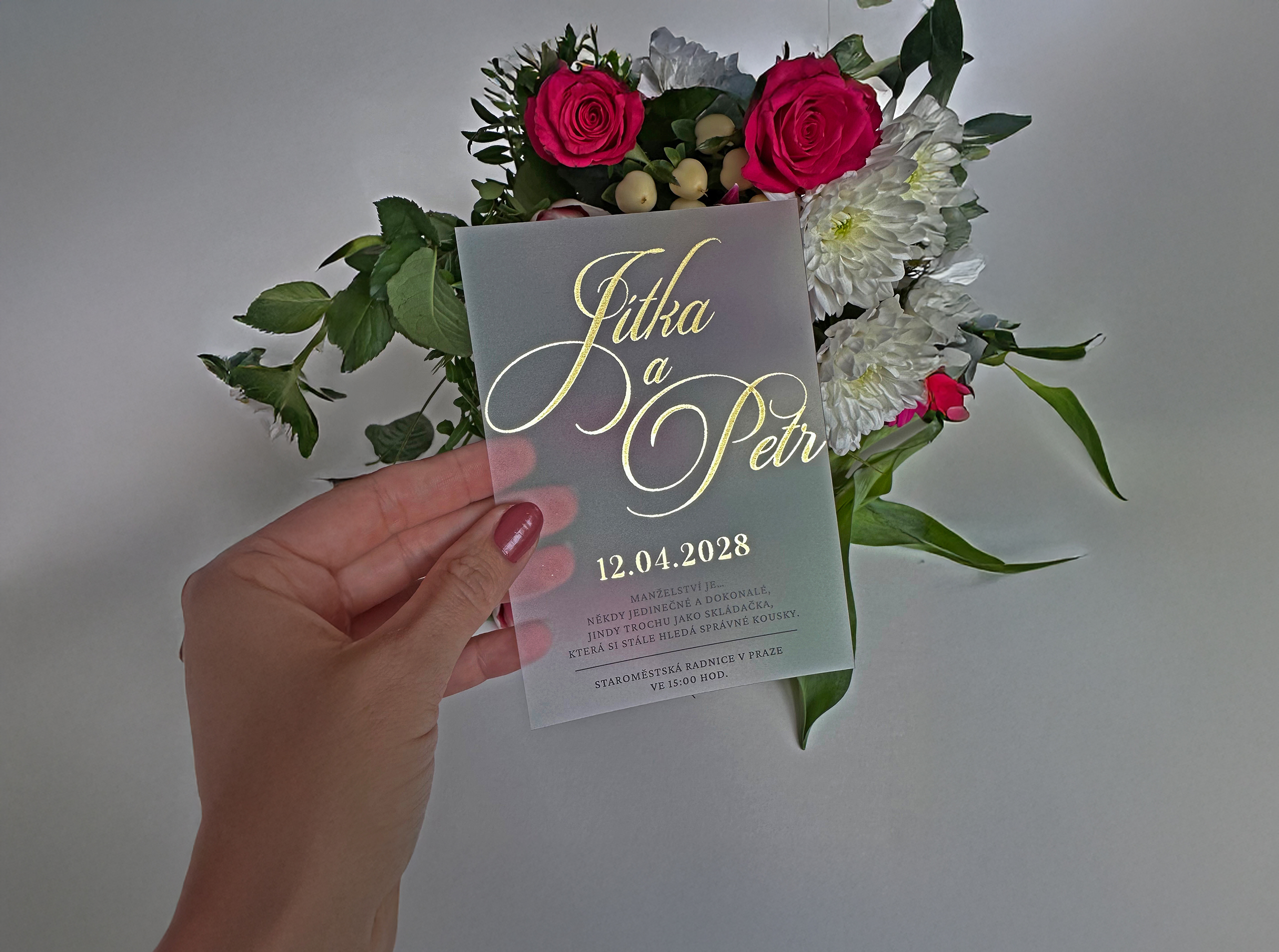 Luxusní transparentní svatební oznámení s metalickým potiskem Mystic Love