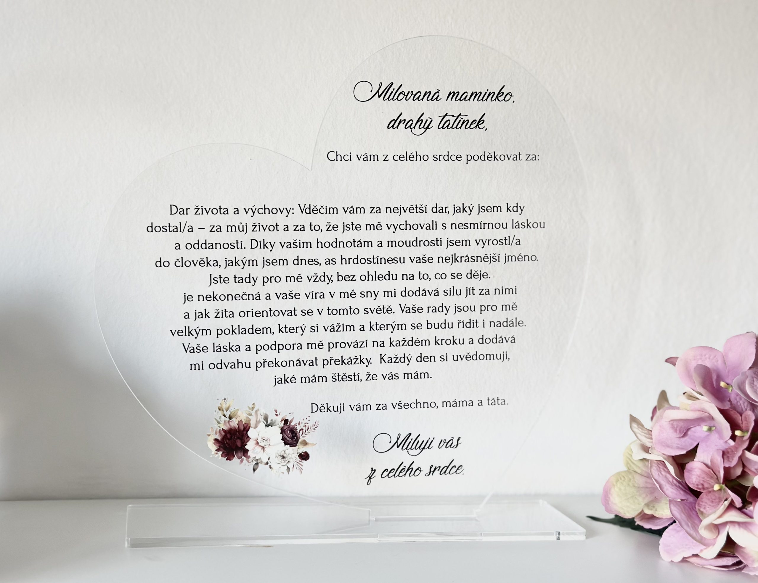 Poděkování z plexiskla – Pro moderní vzhled nabízíme poděkování z plexiskla, které lze personalizovat jmény, datem svatby a vděčnými slovy. Plexisklové poděkování má elegantní, čistý design a skvěle se hodí jako dekorace do každého interiéru.