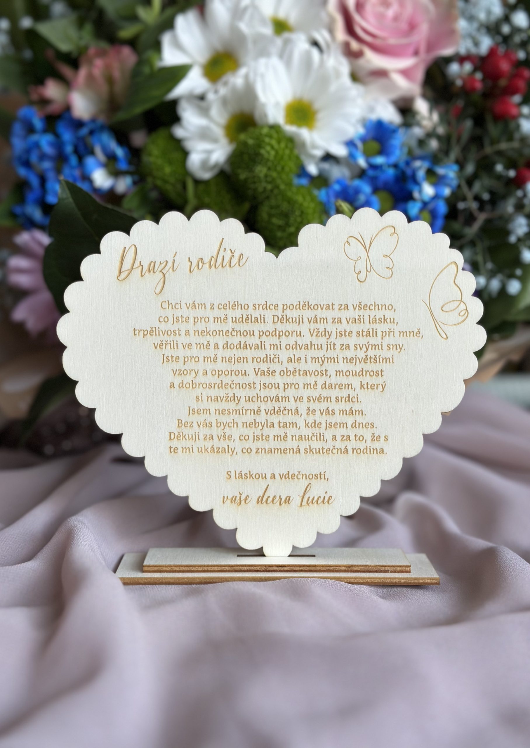 • Dřevěné srdce poděkování rodičům: Klasický a elegantní design, který nikdy nezklame.