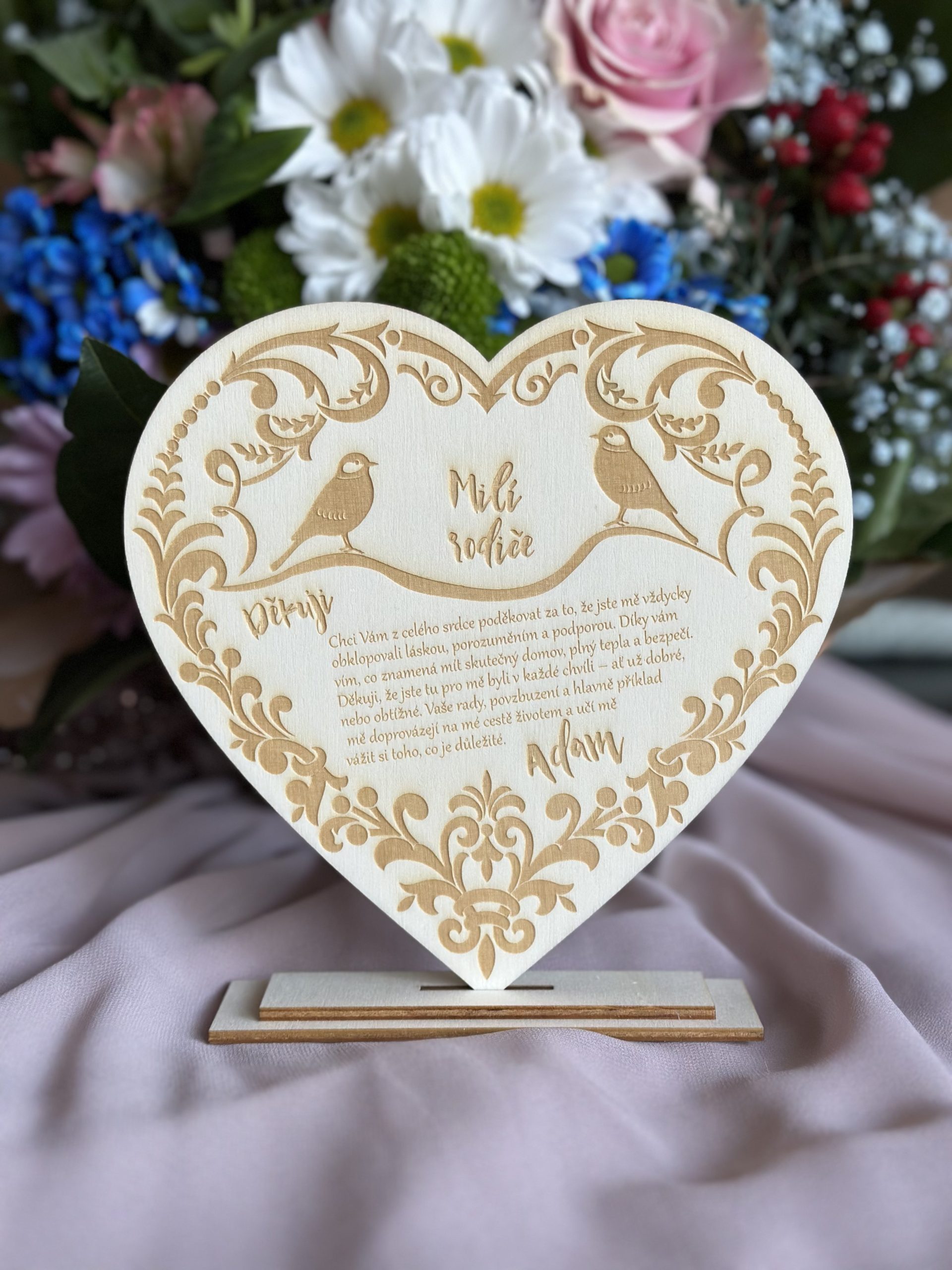 • Dřevěné srdce poděkování rodičům: Klasický a elegantní design, který nikdy nezklame.