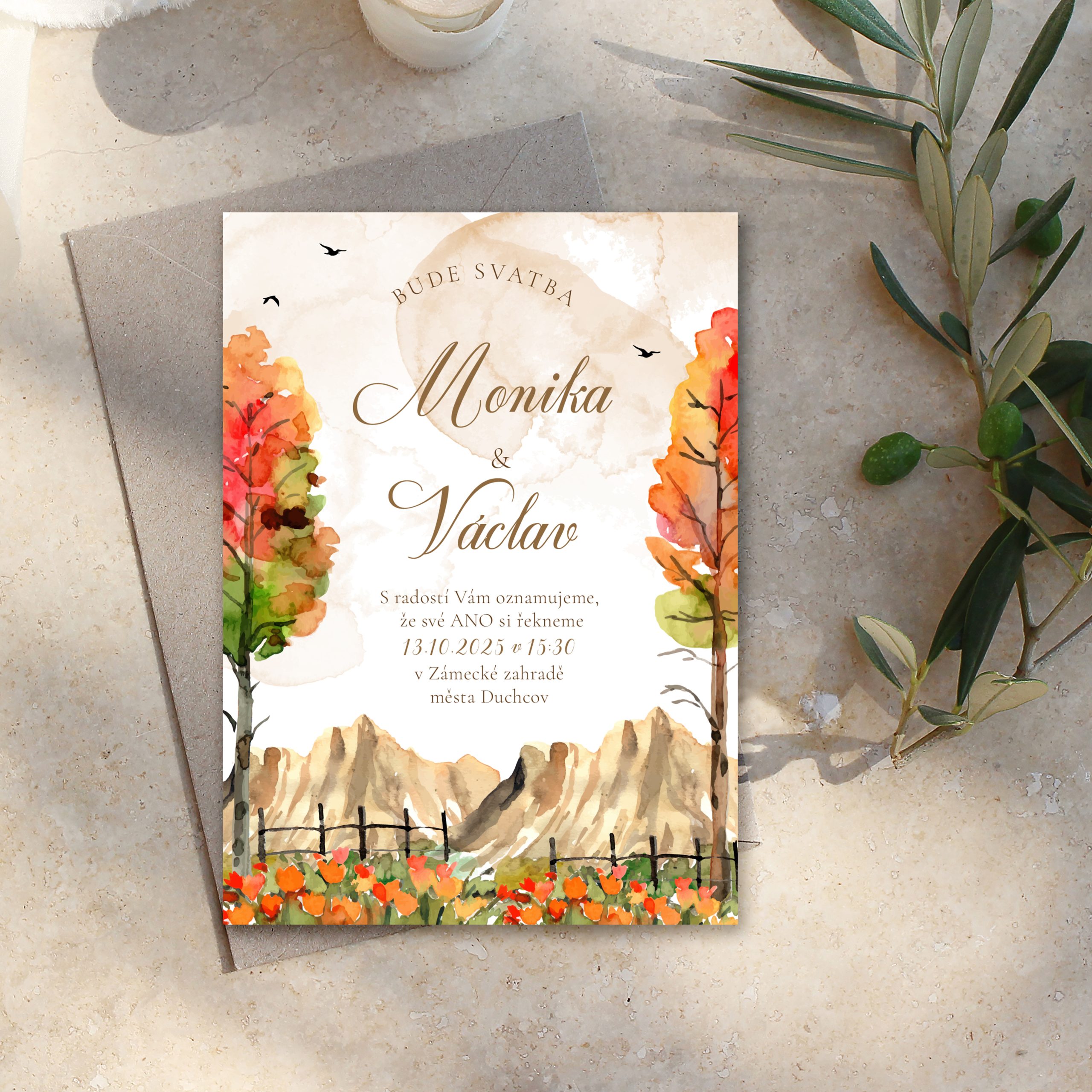Toto oznámení je inspirováno krásou podzimu a je ideální pro páry, které milují kouzlo tohoto ročního období. Design zahrnuje teplé podzimní barvy jako oranžová, zlatá a vínová, spolu s motivy padajícího listí, větviček a přírodních textur. Jemné detaily evokují atmosféru podzimních dní plných romantiky a klidu.