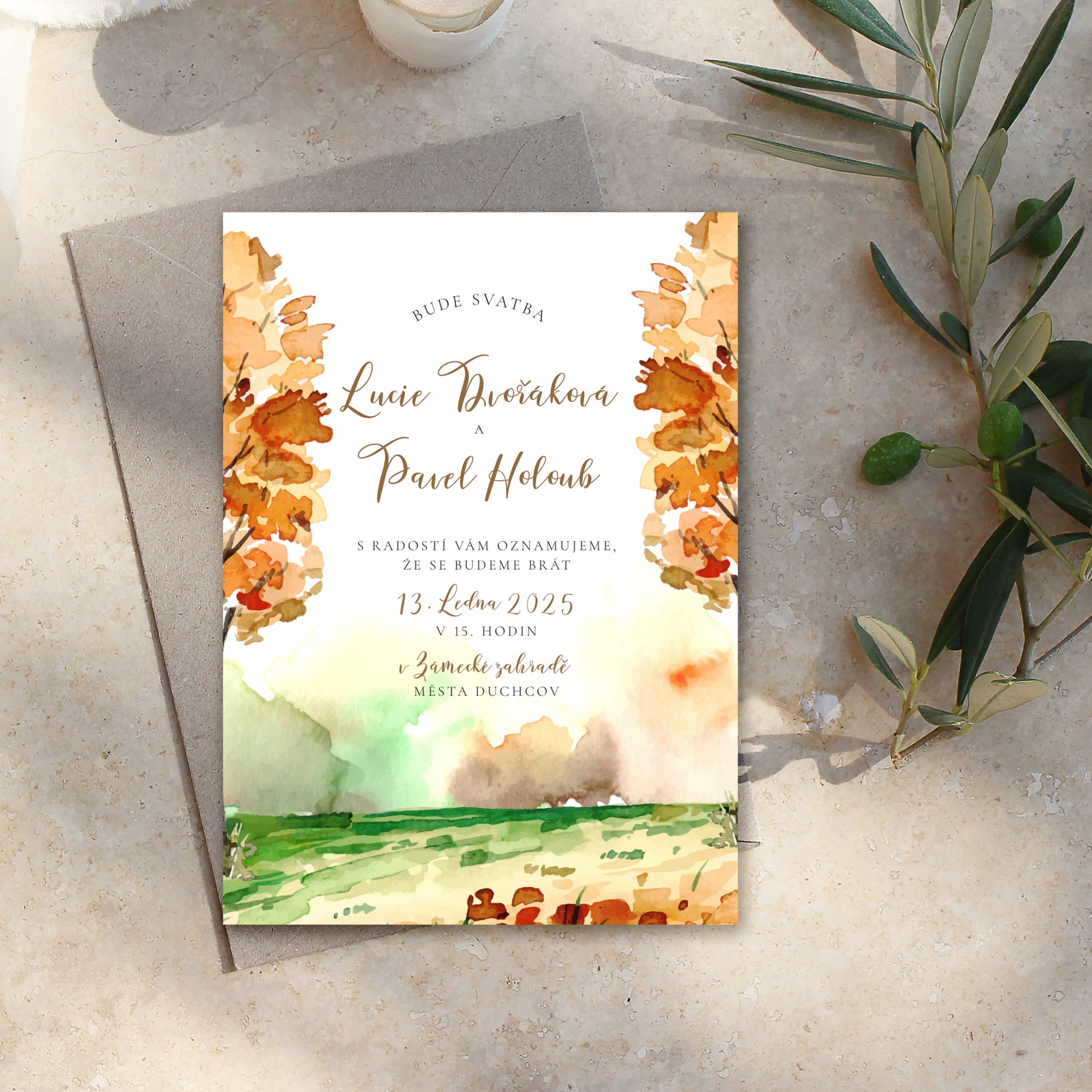 Toto oznámení je inspirováno krásou podzimu a je ideální pro páry, které milují kouzlo tohoto ročního období. Design zahrnuje teplé podzimní barvy jako oranžová, zlatá a vínová, spolu s motivy padajícího listí, větviček a přírodních textur. Jemné detaily evokují atmosféru podzimních dní plných romantiky a klidu.