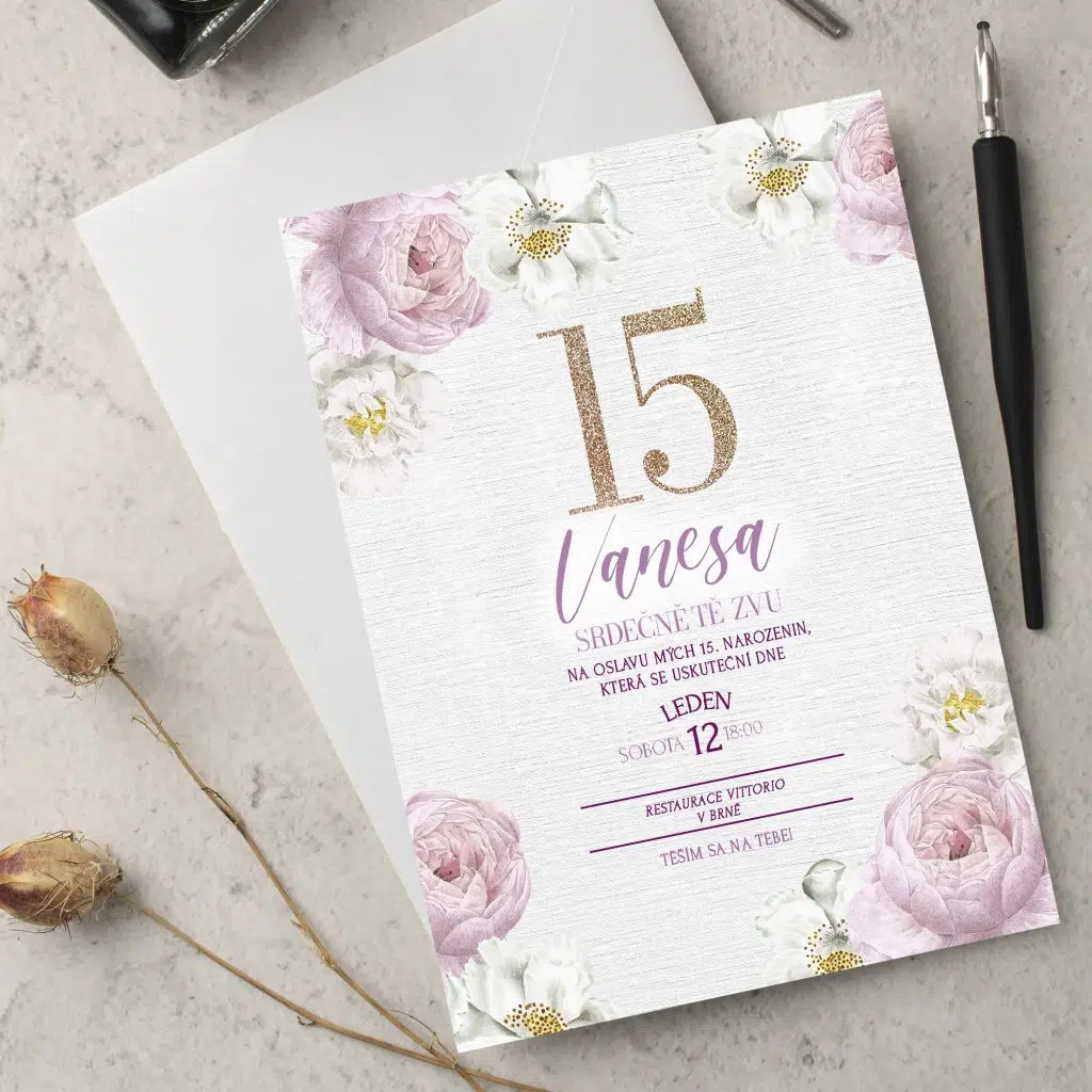 Patnácté narozeniny jsou výjimečnou událostí – stylová oslava na pomezí dětství a dospívání . Tato pozvánka na oslavu 15. narozenin je navržena tak, aby zaujala na první pohled a zároveň elegantně sdělila všechny důležité informace o oslavě.