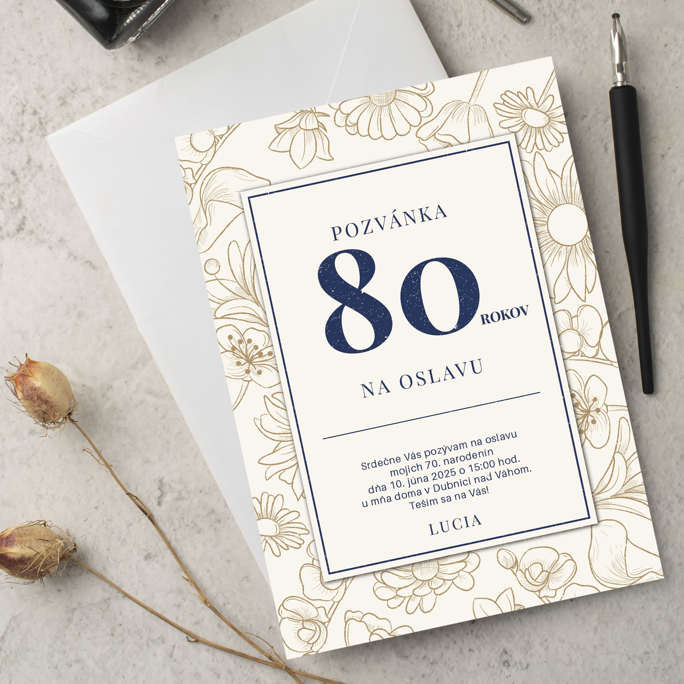 Oslava 80. narozenin je jedinečný okamžik, který si zaslouží být sdílen s těmi nejbližšími. Naše pozvánka na 80 narozeniny vám pomůže elegantně pozvat rodinu, přátele i známé na výjimečnou oslavu. Každá pozvánka je připravena s respektem a péčí – přesně tak, jak si tento den zaslouží.