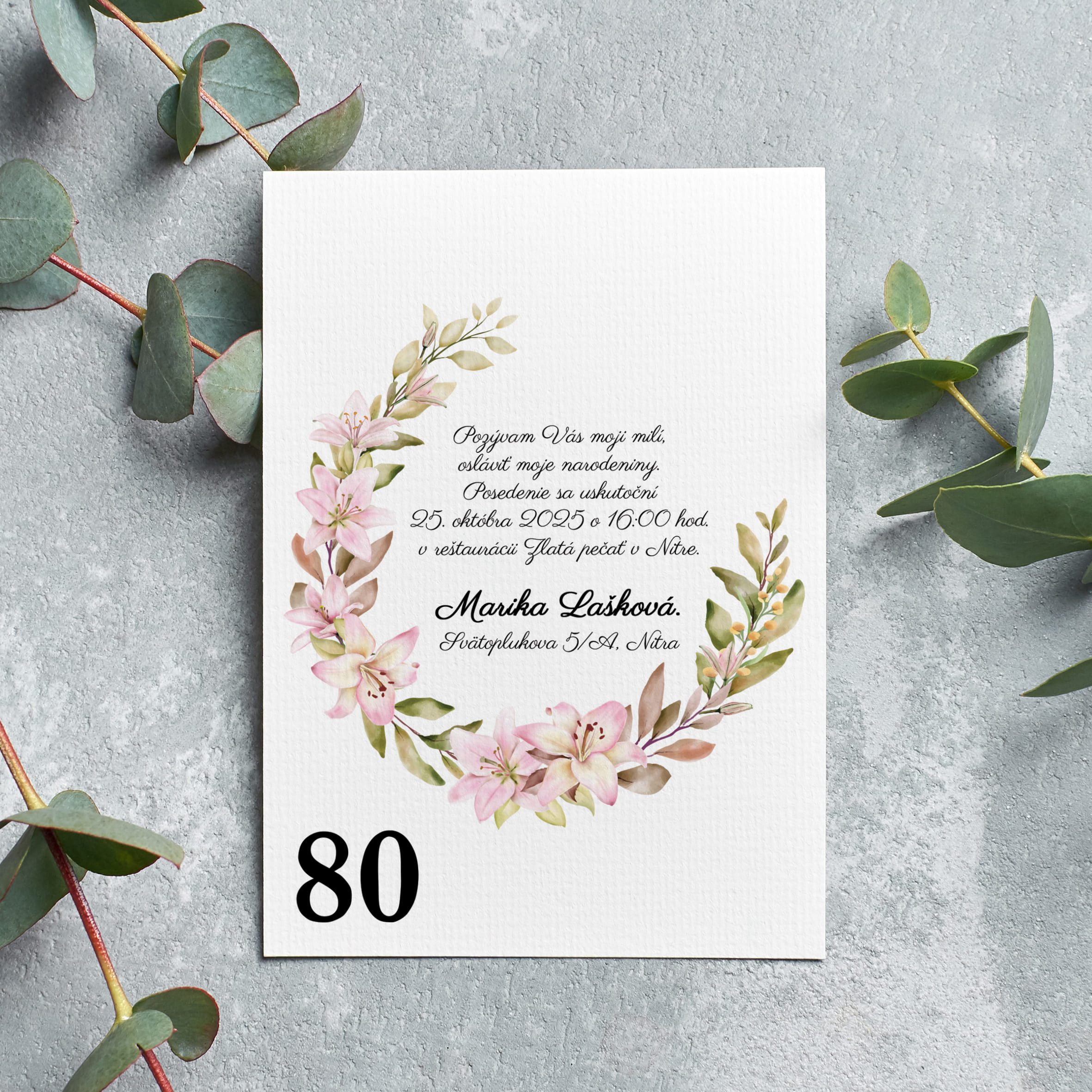 Oslava 80. narozenin je jedinečný okamžik, který si zaslouží být sdílen s těmi nejbližšími. Naše pozvánka na 80 narozeniny vám pomůže elegantně pozvat rodinu, přátele i známé na výjimečnou oslavu. Každá pozvánka je připravena s respektem a péčí – přesně tak, jak si tento den zaslouží.