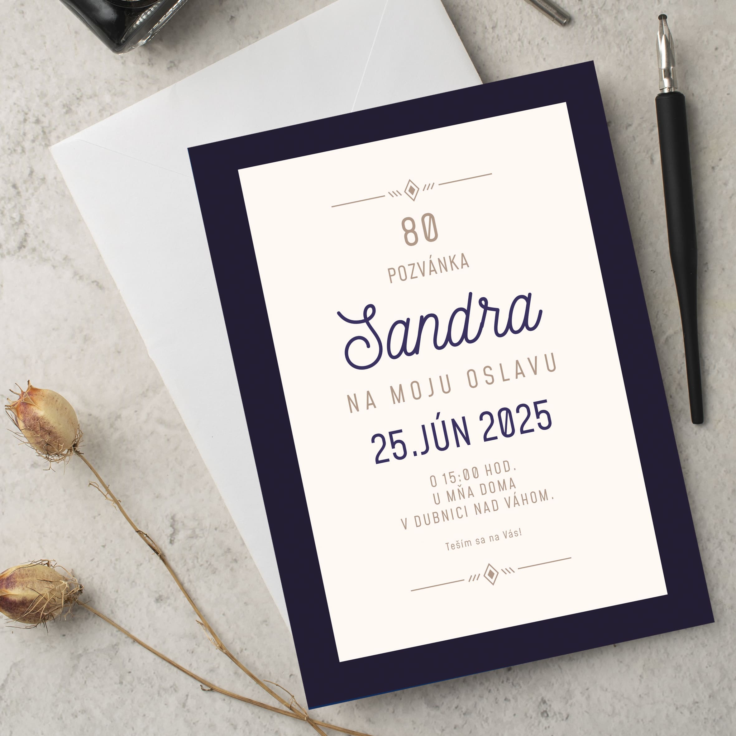 Oslava 80. narozenin je jedinečný okamžik, který si zaslouží být sdílen s těmi nejbližšími. Naše pozvánka na 80 narozeniny vám pomůže elegantně pozvat rodinu, přátele i známé na výjimečnou oslavu. Každá pozvánka je připravena s respektem a péčí – přesně tak, jak si tento den zaslouží.