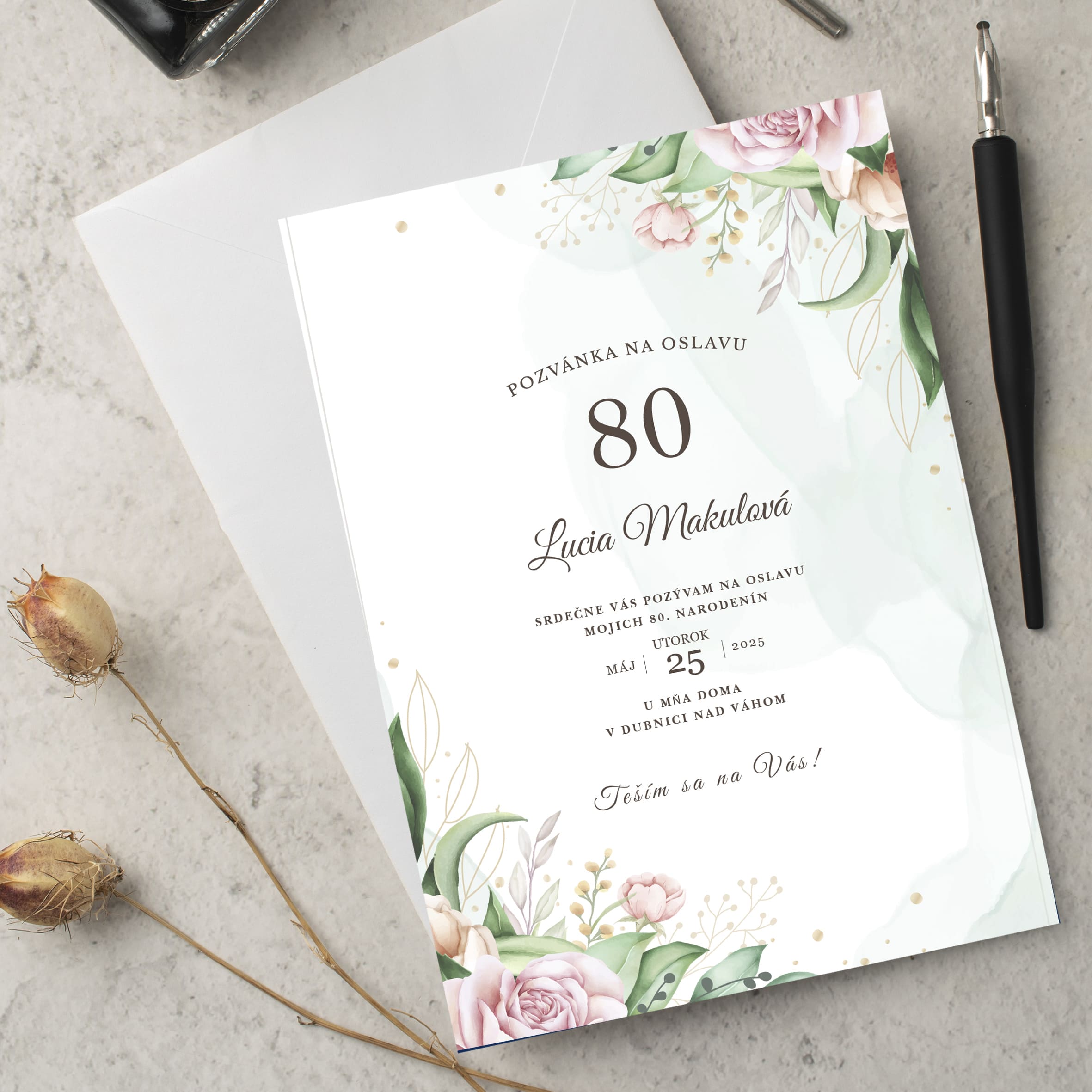 Chystáte rodinný oběd nebo slavnostní setkání? Vyberte si pozvánka k 80 narozeninám ve stylu, který vám bude nejbližší. Ať už dáváte přednost klasice, jemnému květinovému motivu nebo decentní grafice, upravíme vám text aj vzhled pozvánky na míru. Pokud hledáte inspiraci, máme pro vás i pozvánka na oslavu 80 narozenin s hotovým textem, který stačí jen doplnit o osobné detaily.
