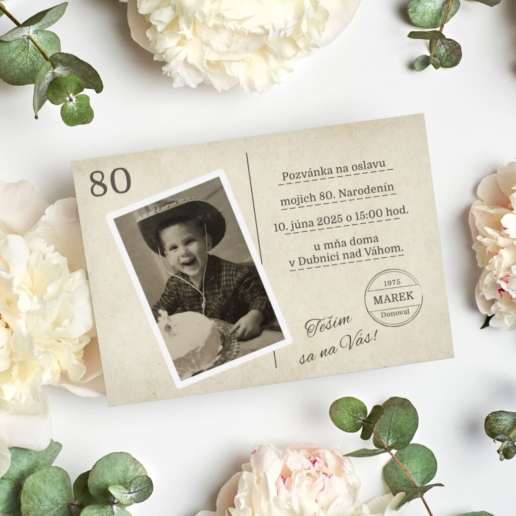 Chystáte rodinný oběd nebo slavnostní setkání? Vyberte si pozvánka k 80 narozeninám ve stylu, který vám bude nejbližší. Ať už dáváte přednost klasice, jemnému květinovému motivu nebo decentní grafice, upravíme vám text aj vzhled pozvánky na míru. Pokud hledáte inspiraci, máme pro vás i pozvánka na oslavu 80 narozenin s hotovým textem, který stačí jen doplnit o osobné detaily.