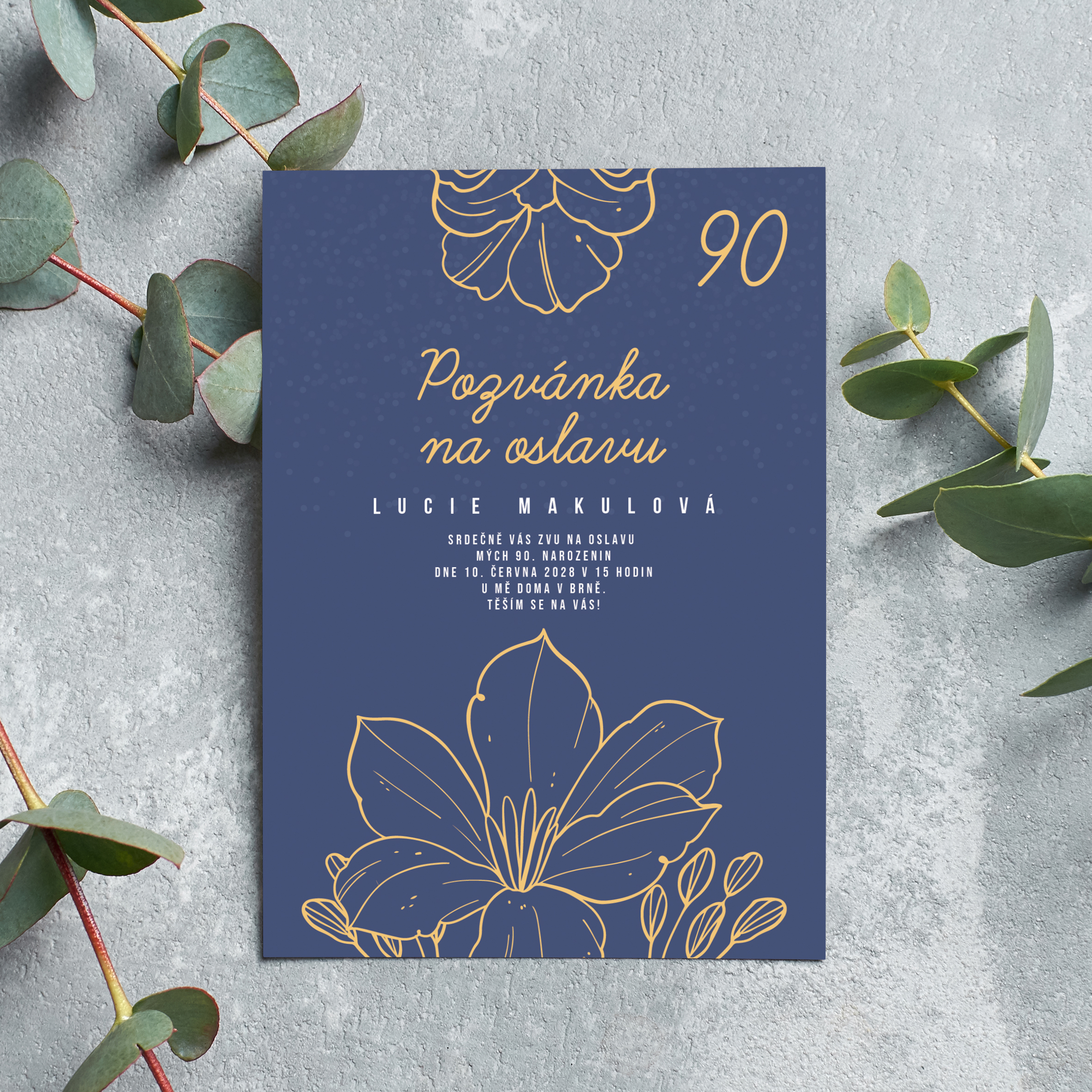 Devadesáté narozeniny jsou výjimečným životním jubileem, které si zaslouží důstojnou a krásnou oslavu . Tato pozvánka na oslavu 90. narozenin je navržena tak, aby elegantně sdělila všechny důležité informace a zároveň vytvořila slavnostní první dojem.