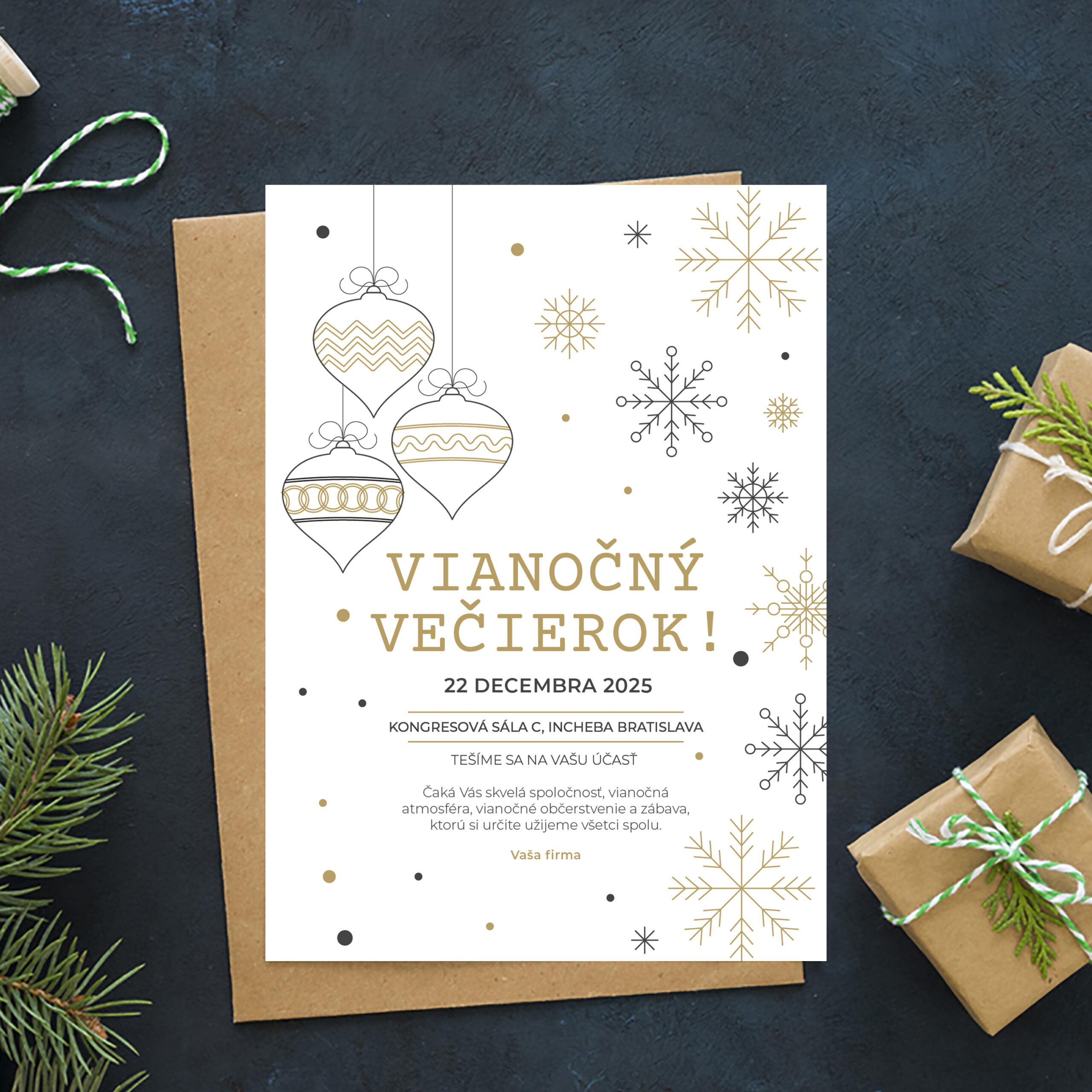 Každá vanocni vecirek pozvanka je dostupná ve třech elegantních formátech: A6 (14 × 10 cm) pro jednoduché rozdání, DL (20 × 10 cm) pro profesionální vzhled a čtvercový formát (14 × 14 cm), který upoutá svým stylem. Rádi vám poradíme, co se hodí právě pro váš vánoční večírek.