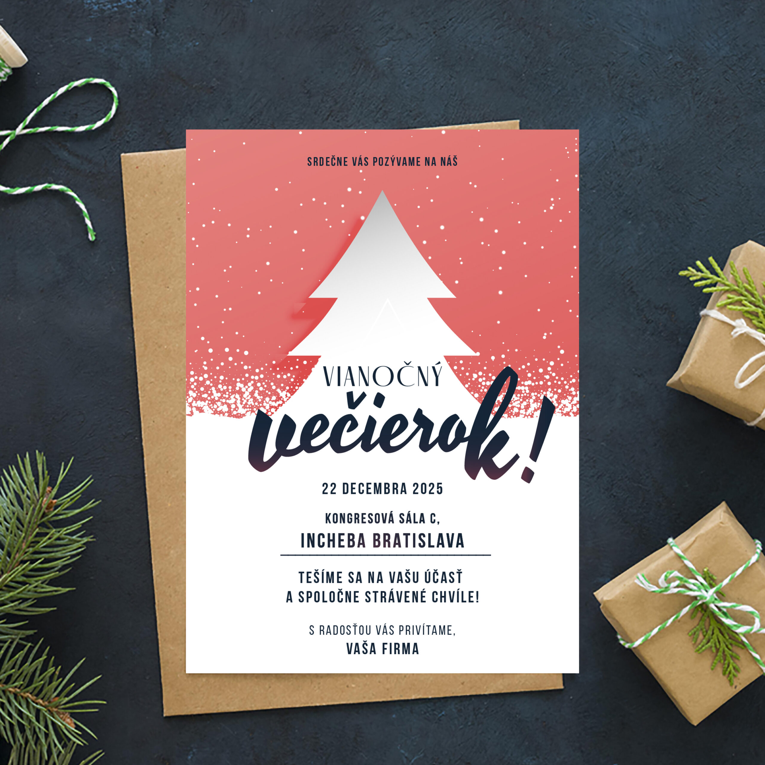 Chystáte vánoční setkání pro tým nebo klienty? Využijte pozvánka na firemní večírek nebo pozvánka na firemní vánoční večírek s elegantním designem. Připravili jsme pro vás i pozvánka na firemní večírek vzor a pozvánka na firemní večírek text, které jednoduše upravíte. Samozřejmostí je i pozvánka na firemní vánoční večírek text s vaším logem a podpisem.