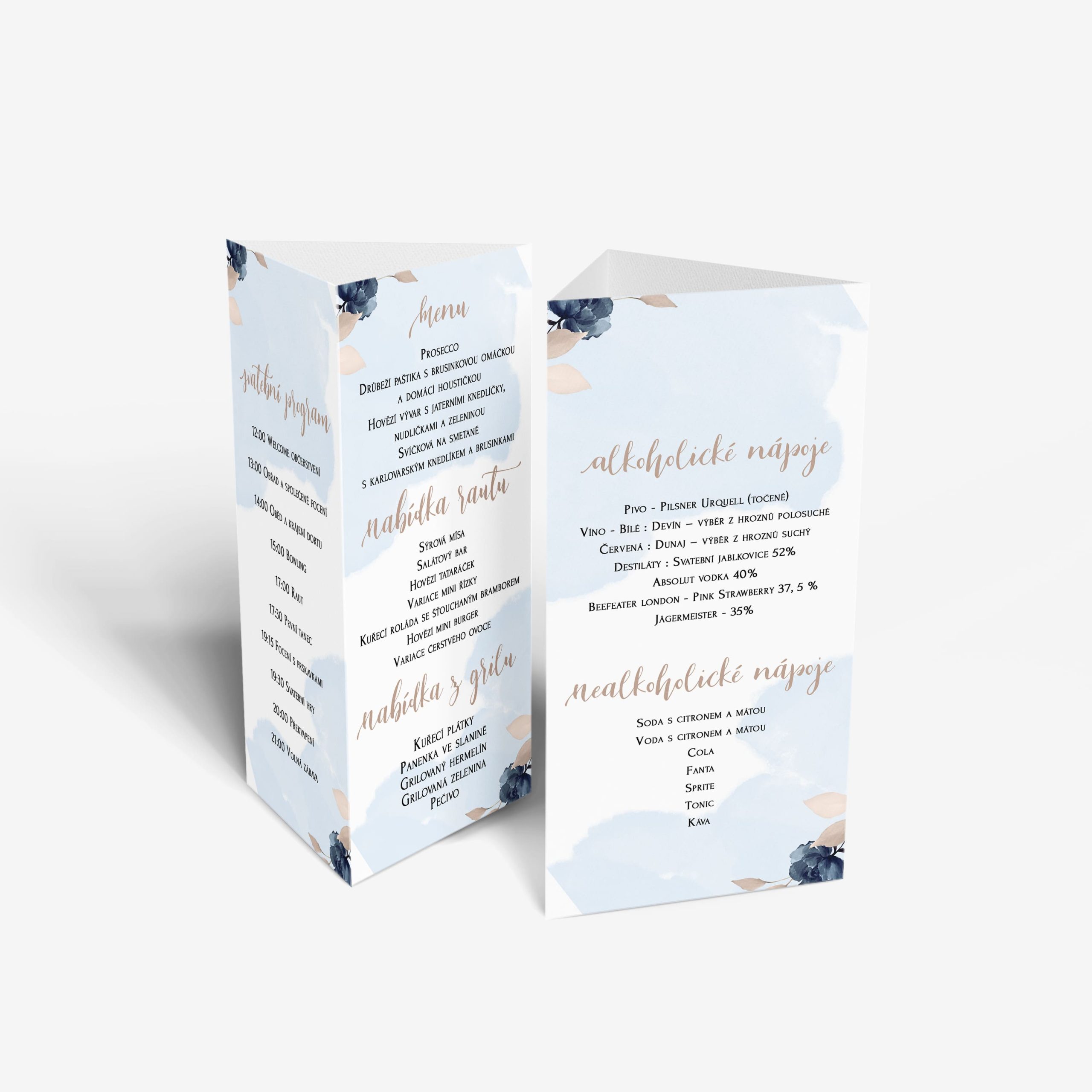 Dodajte své svatební hostině šmrnc s originálním svatebním menu ve formě trojhranného stojanu. Tento formát A4, dvakrát složený a pevně zlepený, stojí přímo na stole a je dobře viditelný z každého úhlu. Hosté tak mají po celou dobu přehled o servírovaných chodech, nápojích i svatebním programu.