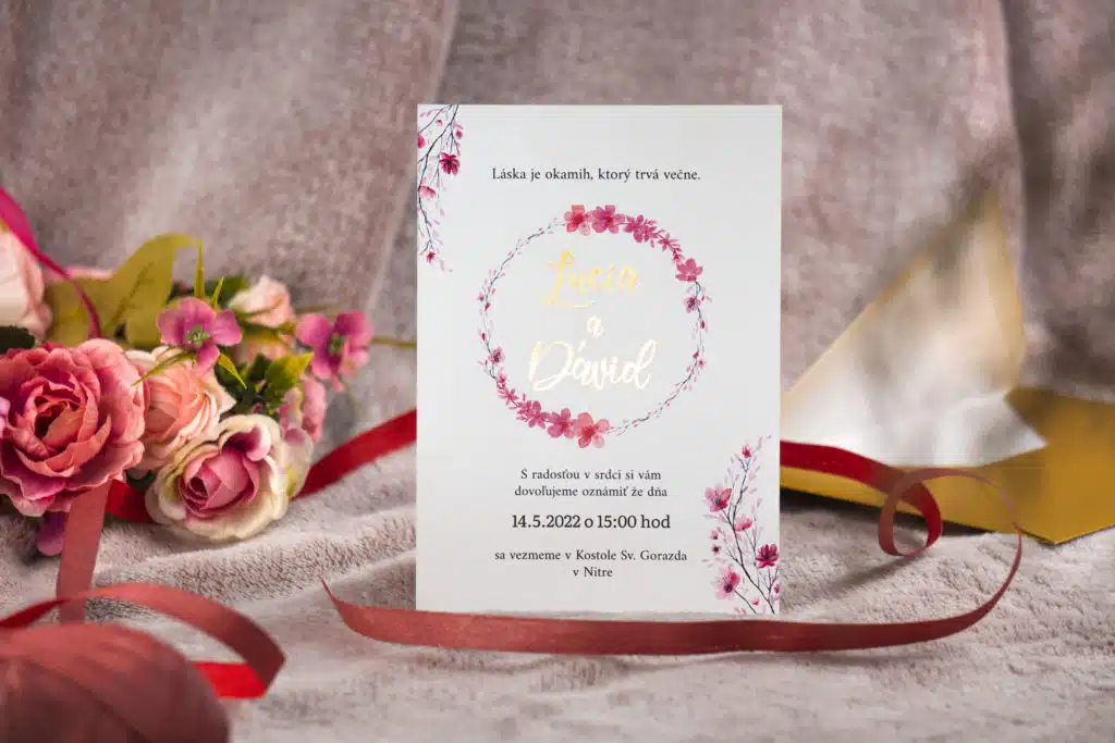 Krásné svatební oznámení s florálním kruhem a metalickým tiskem.