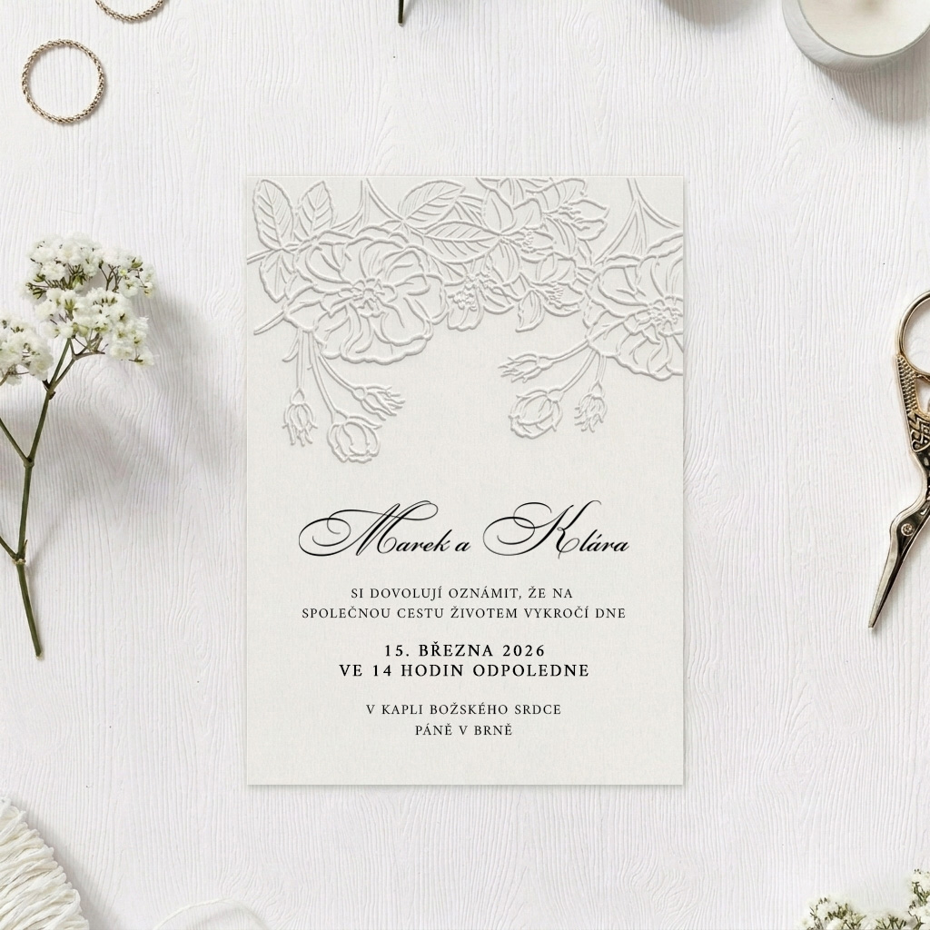 Toto embosované svatební oznámení není jen kousek papíru. Je to vzpomínka, která přetrvá roky.