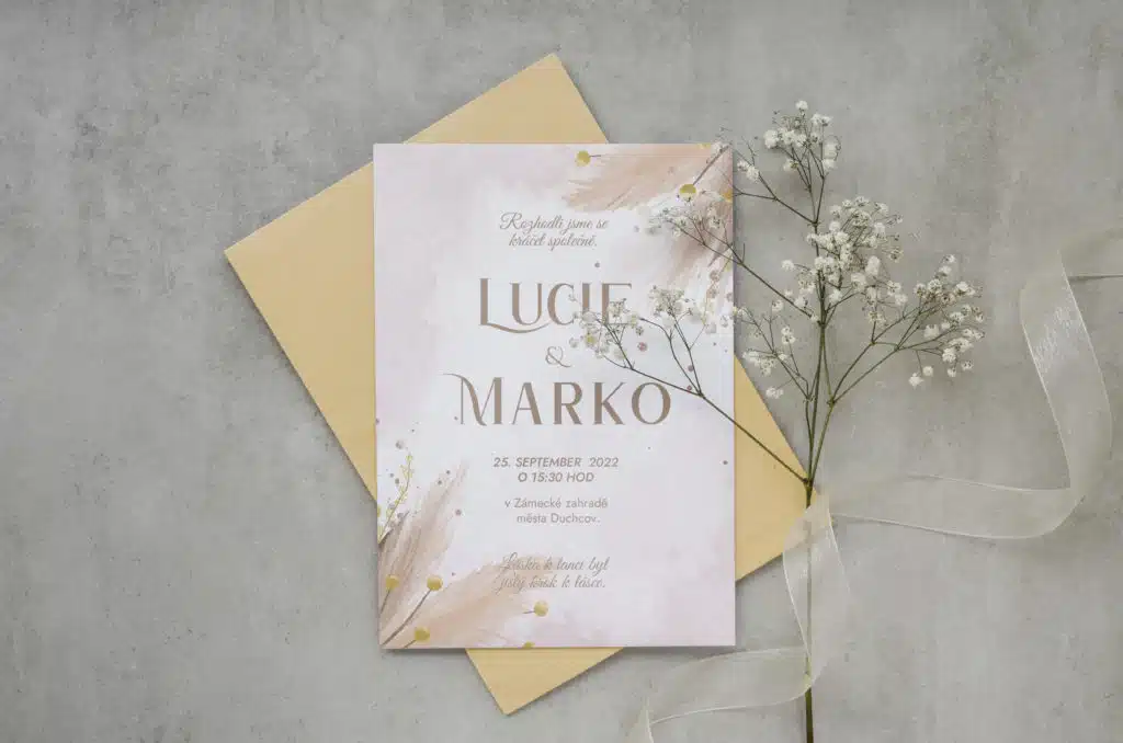 Luxusní svatební oznámení s pampovou trávou v teplých pastelových odstínech. Nejnovější design, který vychází ze současných moderních trendů v oblasti svatebních oznámení.