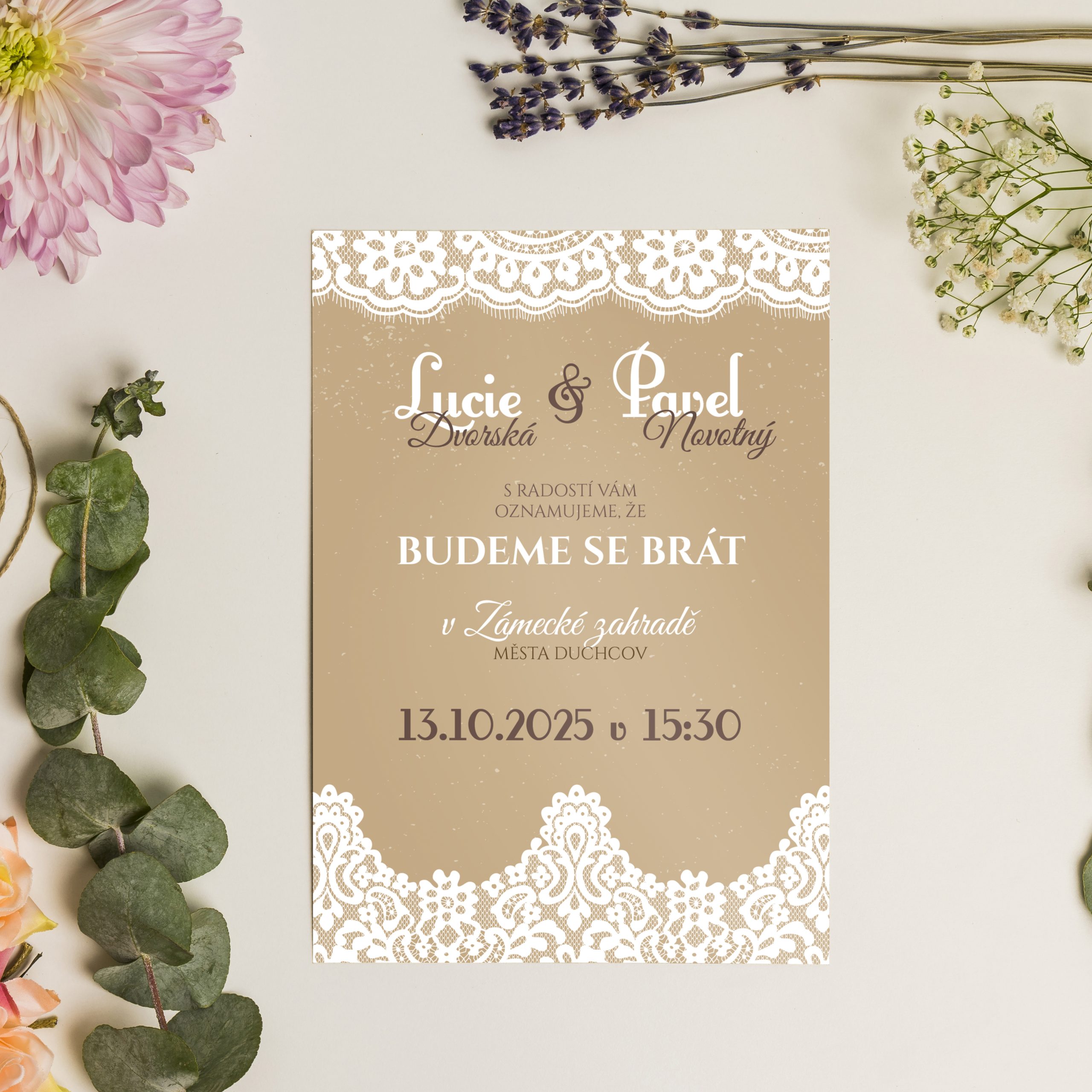 Pro romantické páry, které touží po jemnosti a eleganci, je toto oznámení s krajkou perfektní volbou. Krajkové detaily na pozadí přidávají vznešený a tradiční nádech, který je ideální pro svatbu v klasickém stylu. Jemné barvy a elegantní design vytvářejí útulnou a láskyplnou atmosféru.