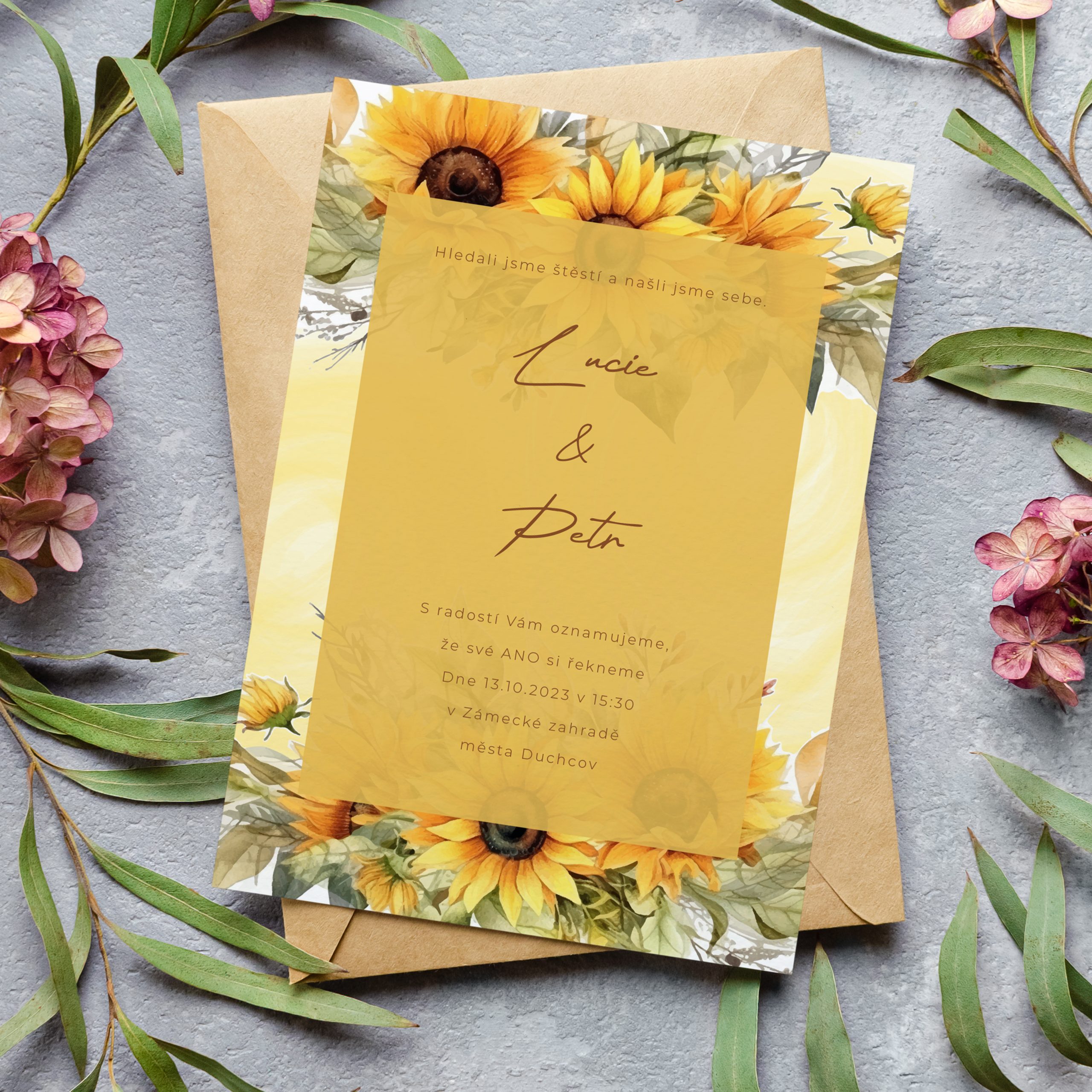 Slunečnice jsou symbolem štěstí, optimismu a energie. Oznámení se slunečnicemi vytváří světlou a radostnou atmosféru, ideální pro páry, které chtějí vyjádřit svou radost a lásku v živých a energických barvách. Toto oznámení je skvělou volbou pro svatbu v letním nebo slunečném období.