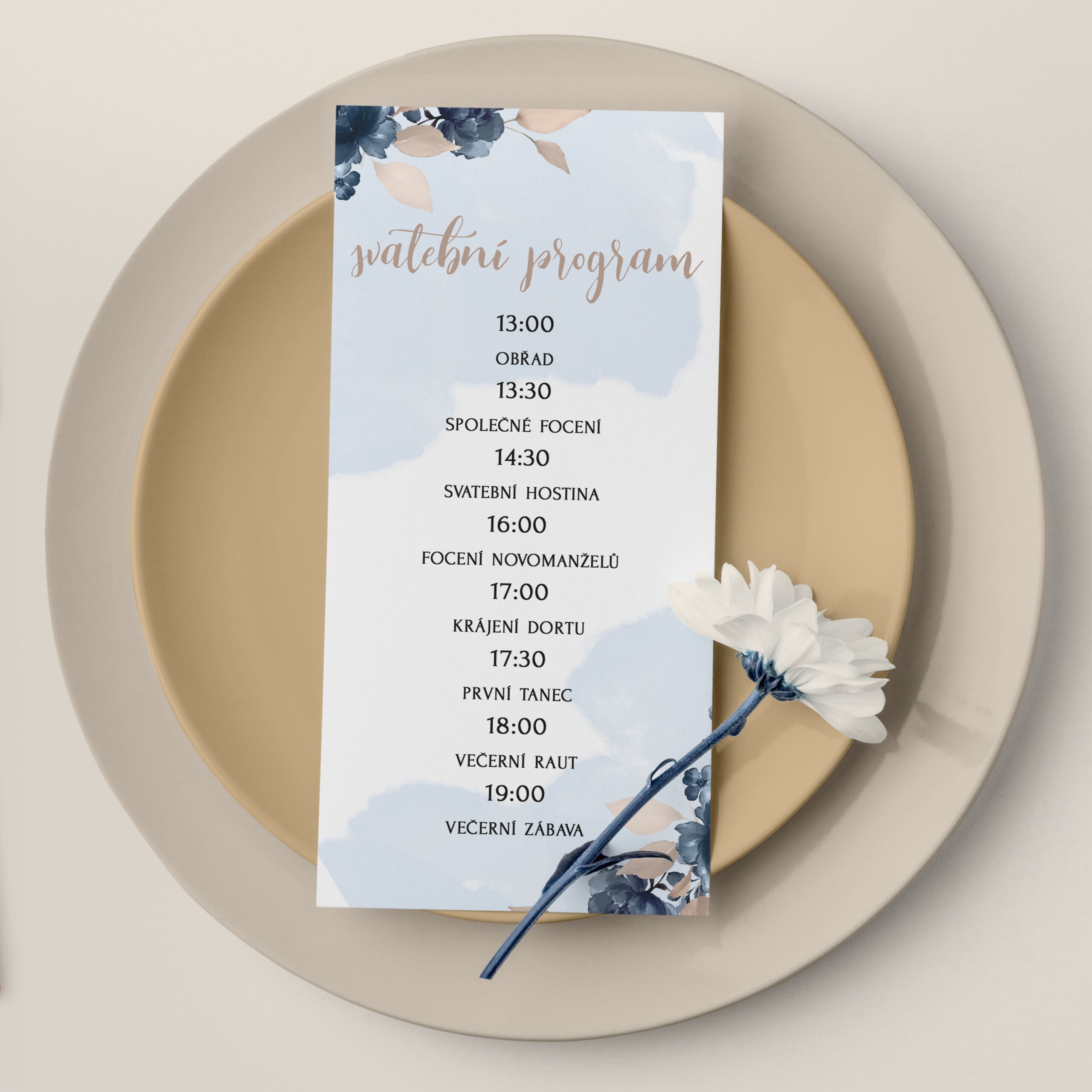 Vytvořte dokonalý svatební den s personalizovaným svatebním programem v elegantním formátu DL. Tento stylový a praktický doplněk nejenže hosty informuje o harmonogramu vašeho velkého dne, ale zároveň slouží jako krásná památka pro svatební chvíle.
