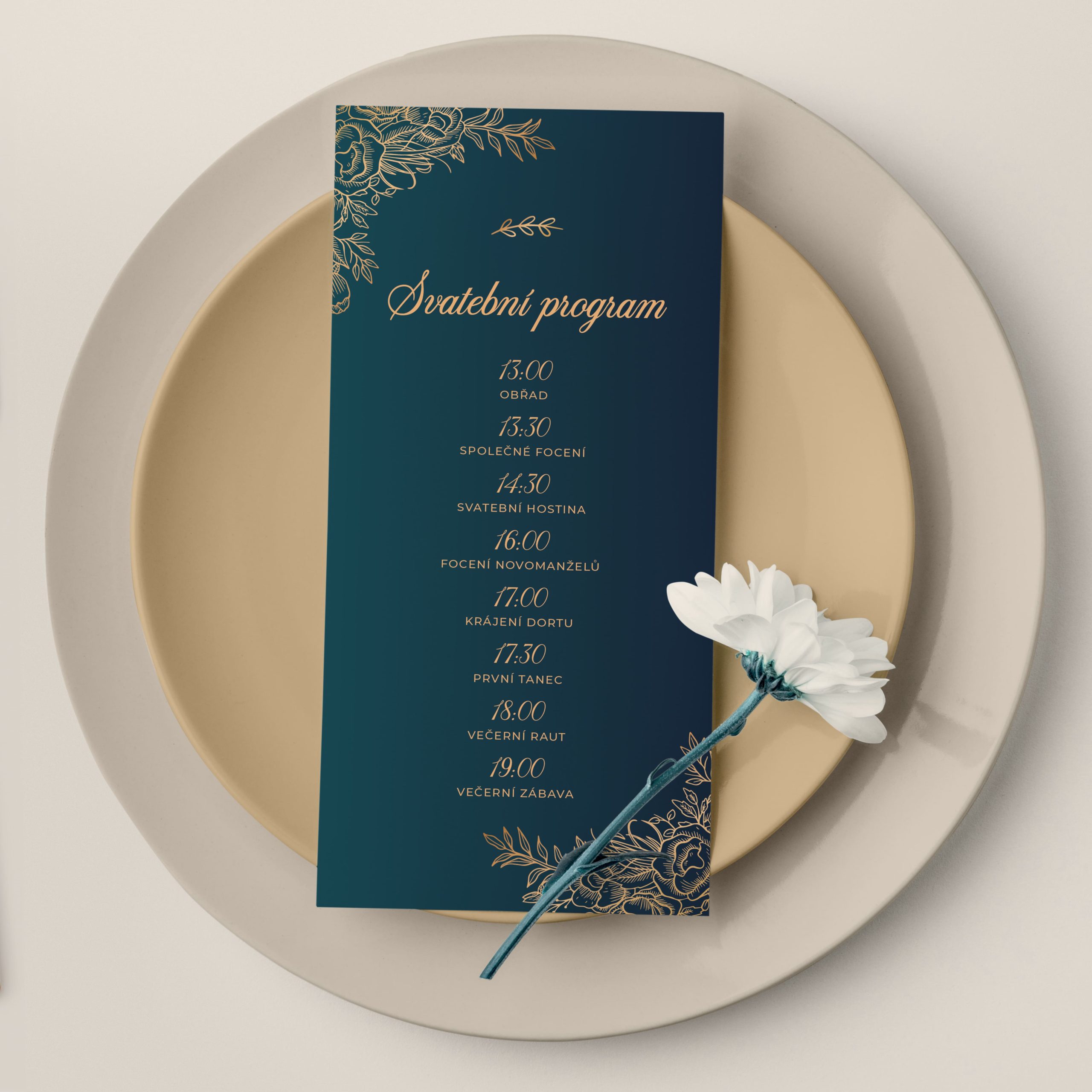 Svatební program tmavězelený se zlatým písmem – tisk na formát DL