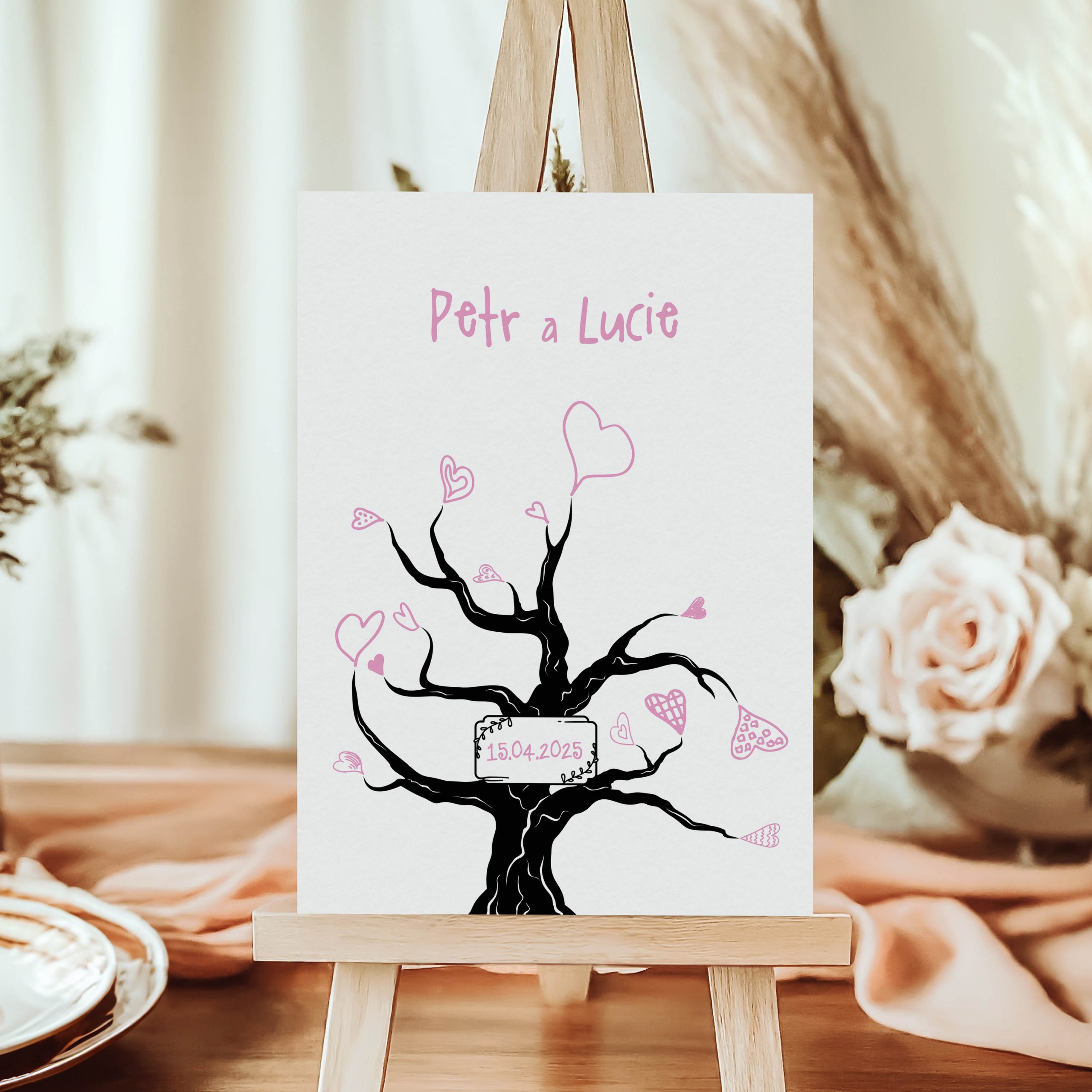 Chcete na svatbě vytvořit nezapomenutelnou památku, která bude novomanželům připomínat jejich velký den a lidi, kteří s nimi tento okamžik sdíleli? Plakát „Strom vzpomínek“ je krásným řešením! Tento jedinečný plakát s ilustrací stromu je navržen tak, aby na něj svatební hosté mohli přidávat své podpisy nebo otisky, čímž vytvoří neopakovatelnou vzpomínku na svatební oslavu.