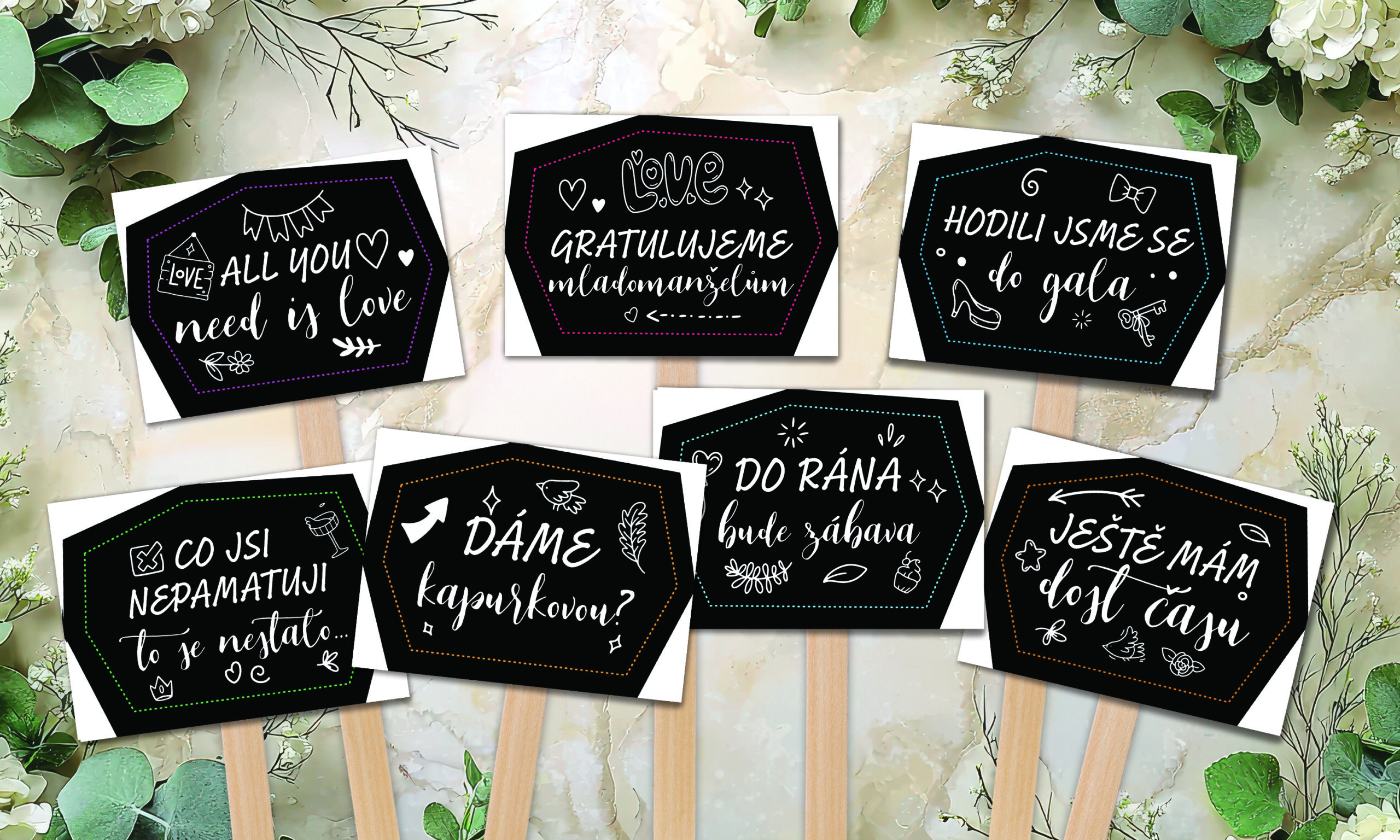 Sada 7 vtipných cedulek na focení ve formátu A6, nalepených na dřevěné tyčce. Skvělá rekvizita do svatebního fotokoutku, která pobaví všechny hosty.