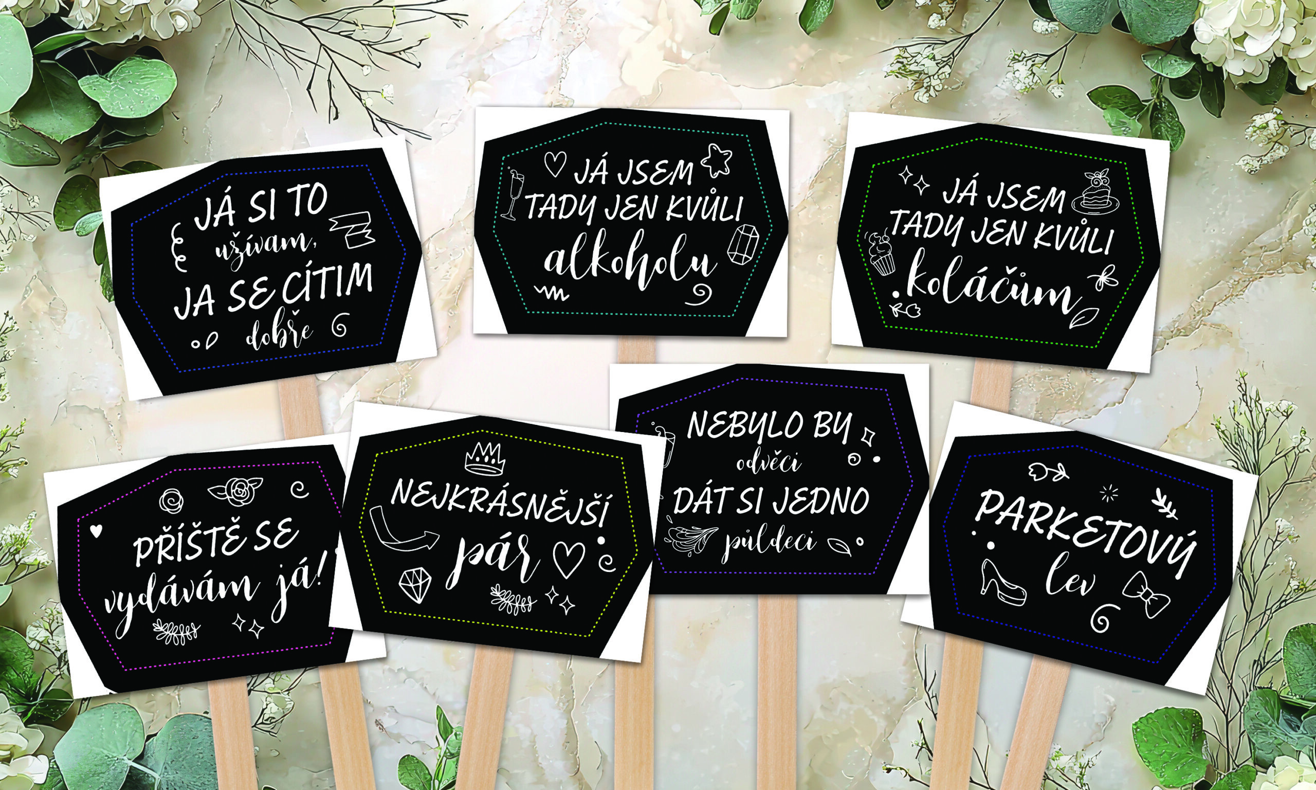 🎁 Každý set obsahuje 7 různých cedulek s originálními hláškami, které pobaví opravdu každého – od nevěsty až po svatebního strýčka.