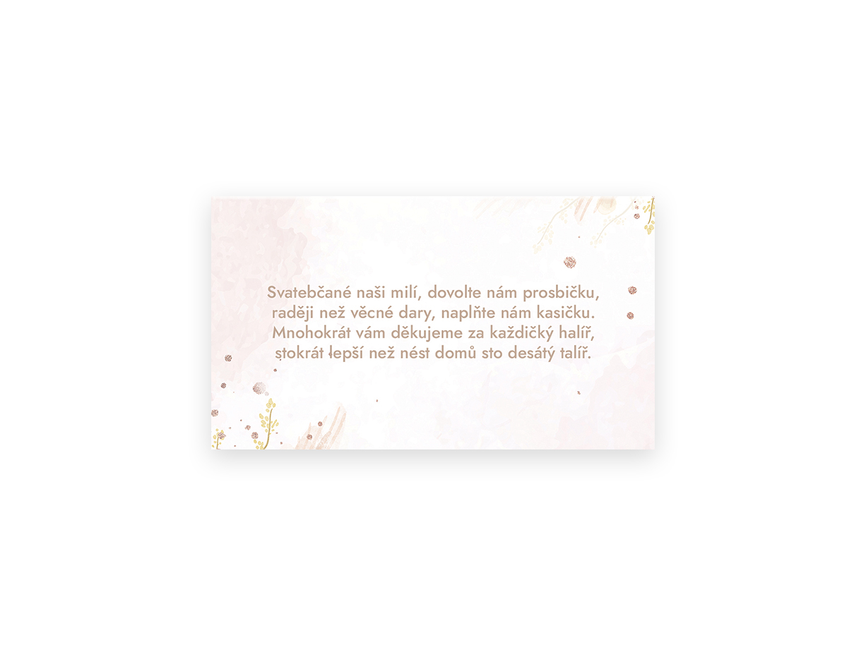 Vyrobena z kvalitního papíru s luxusní povrchovou úpravou a elegantní grafikou, tato kartička nejen esteticky doplní svatební oznámení, ale také podtrhne váš vkus. Na kartičce je prostor pro osobní zprávu či básničku, která může laskavě vyjádřit vaši preferenci ohledně svatebního daru.