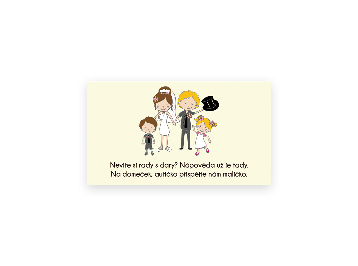• Svatebčané naši milí, dovolte nám prosbičku, raději než věcné dary, naplňte nám kasičku. Mnohokrát vám děkujeme za každičký halíř, stokrát lepší než nést domů sto desátý talíř.