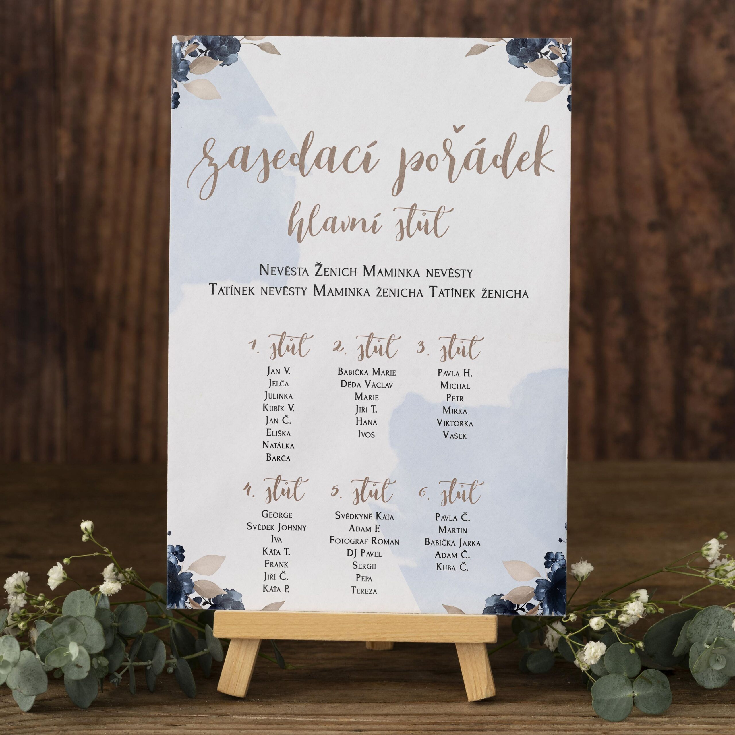 Zasedací pořádek na svatbu pro vás vyhotovíme ve formátu A3 nebo A2. Design zasedacího pořádku vypracujeme na míru pro každého zákazníka. Můžete si vybrat z nabídky našich designů svatebních oznámení a v tom stylu vypracujeme zasedací pořádek, nebo nám můžete zaslat svou představu.