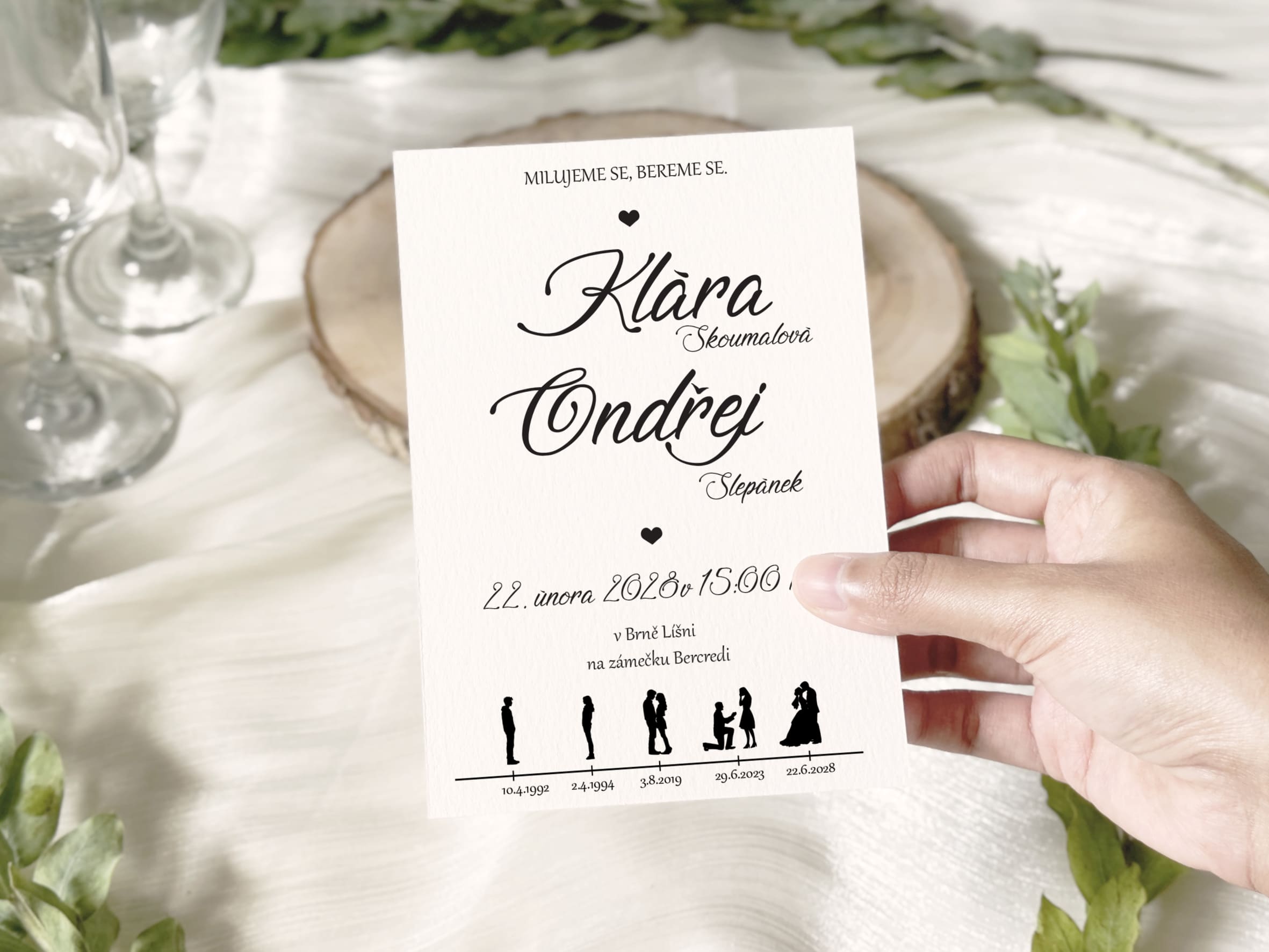 Oznámení s časovou osou je skvělý způsob, jak přidat osobní dotek a přehledně představit váš příběh. Hosté budou nadšeni, když uvidí, jak vaše vztahové kroky vedly k tomuto nádhernému dni.